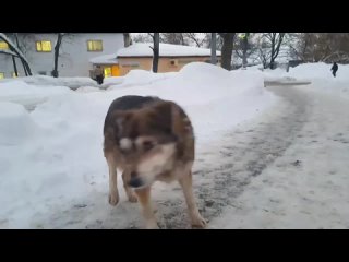 Добрая, но чуть боязливая незнакомых, ей некуда была идти, бегала от меня, потом забежала за угол и вырыла лунку в снегу и легла прям там!