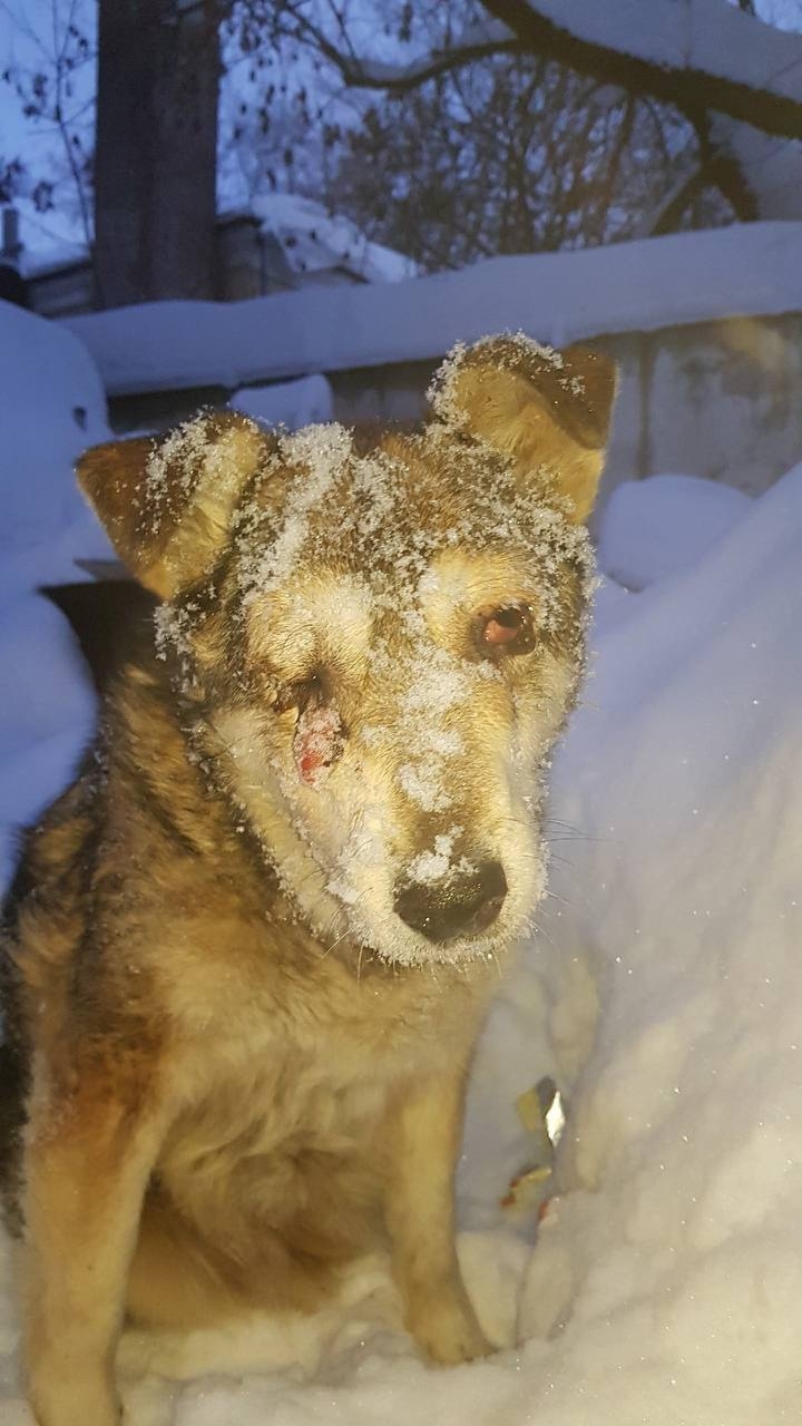 В ~18 вечера по пути на работу, проездом увидела пожилую собаку – подошла на встречу в ужасном состоянии – из глаза висит мясо, второй тоже почти полностью чем то закрыт!