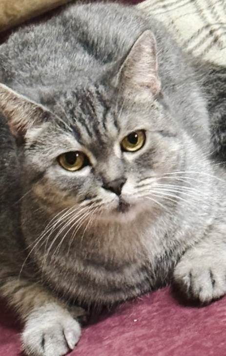 Серая, домашняя, с яркими оранжевыми глазами. Очень дружелюбная, но может пугаться незнакомцев.