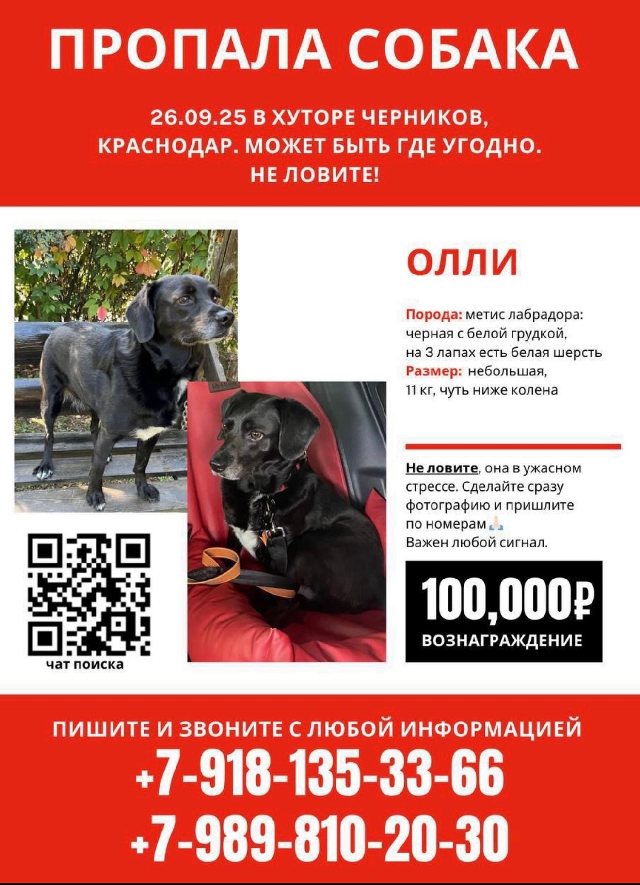 Вознаграждение нашедшему Олли 100 000 рублей.