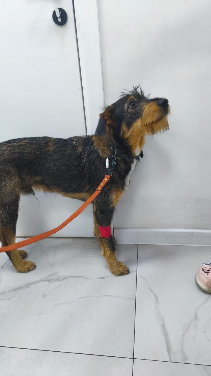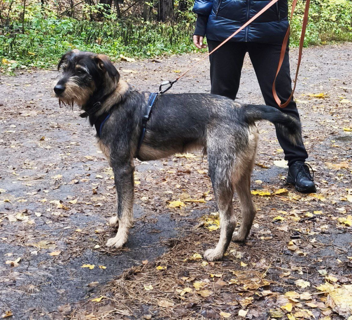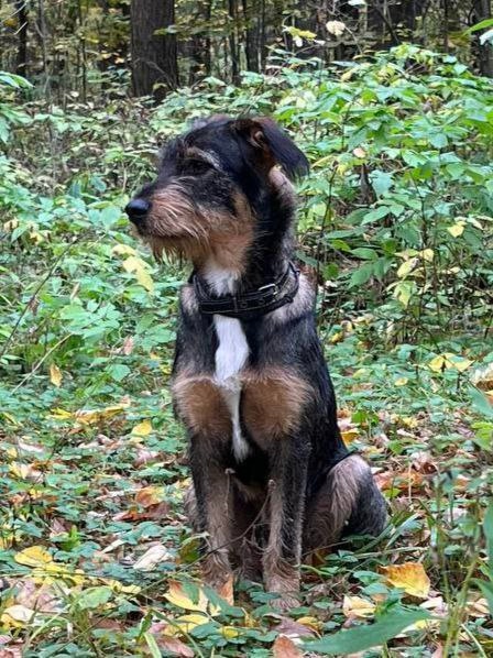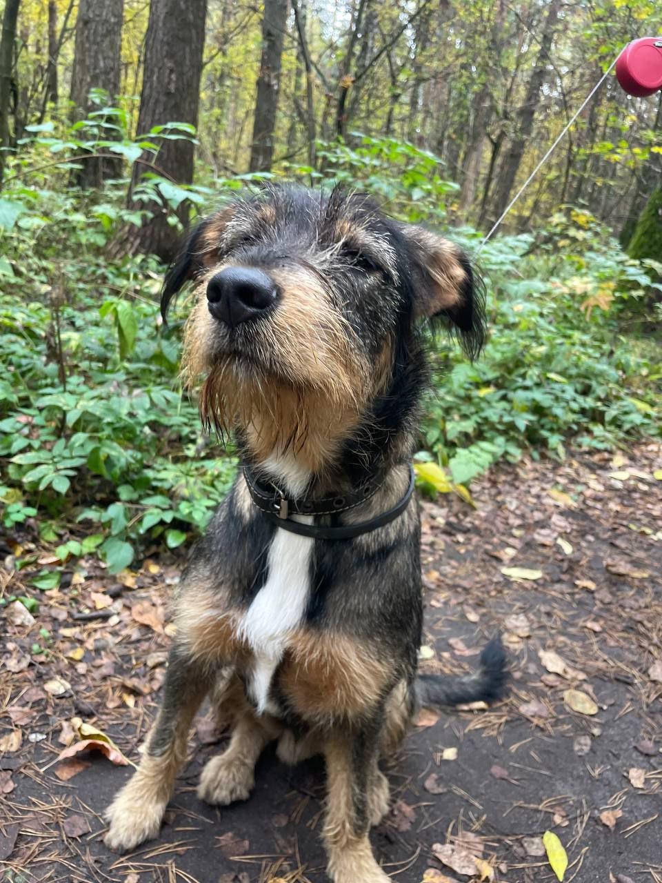 Молодой кобель, метис  “бородатик”, не кастрирован, вес около 20кг.  Темно коричневый верх, низ светлее с рыжиной, на груди белая полоска.