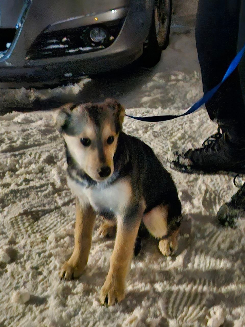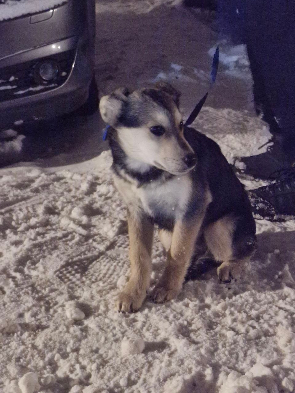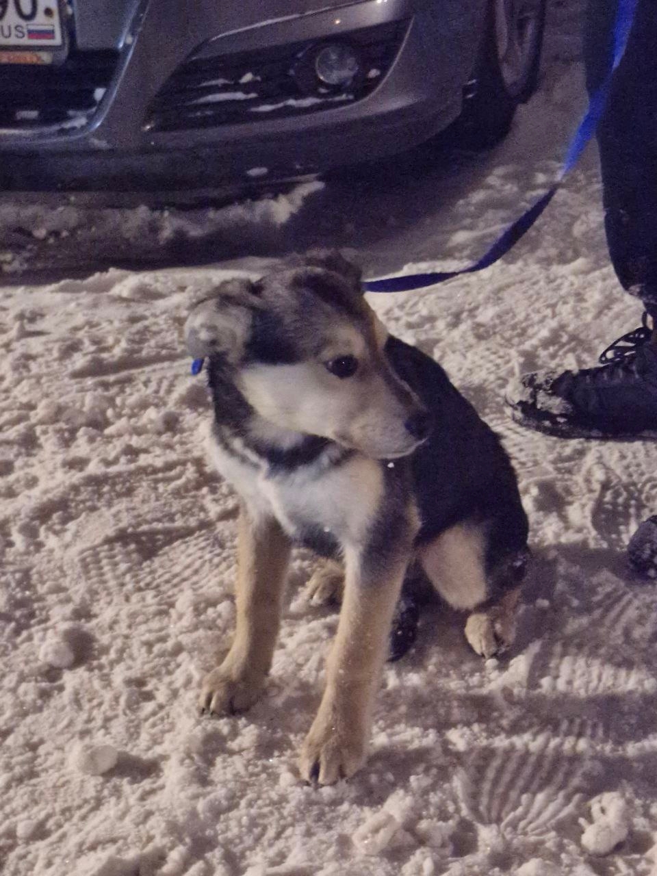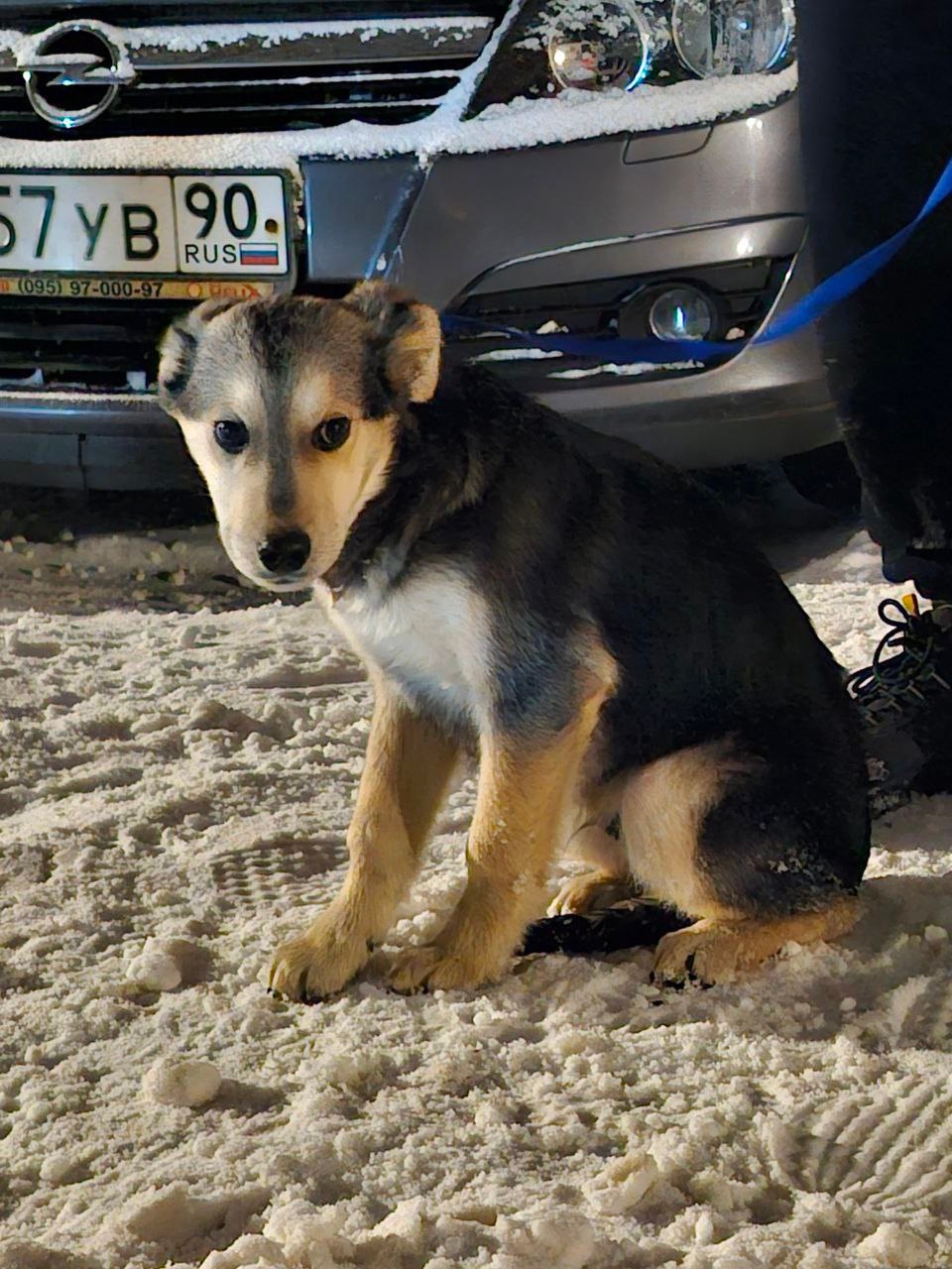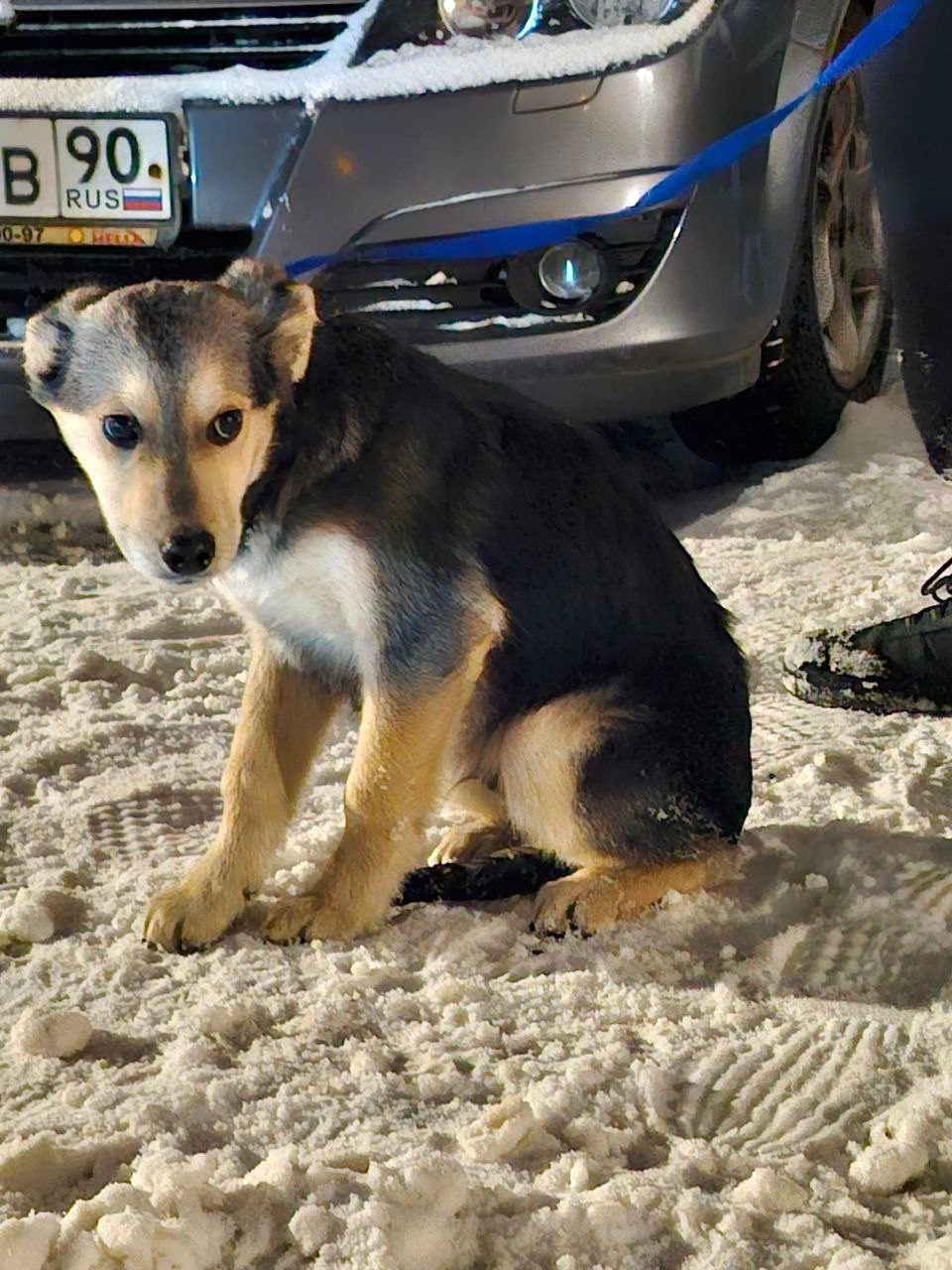 Щенок, помесь овчарки, мальчик с поводком синего цвета, сидел под машиной