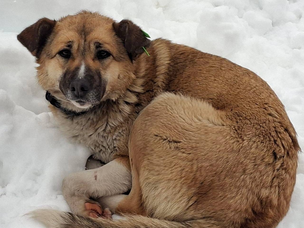 Приблудилась рыжая собака с зеленой биркой в ухе и в ошейнике, пол не известен, спит в снегу… хромает на переднюю лапку