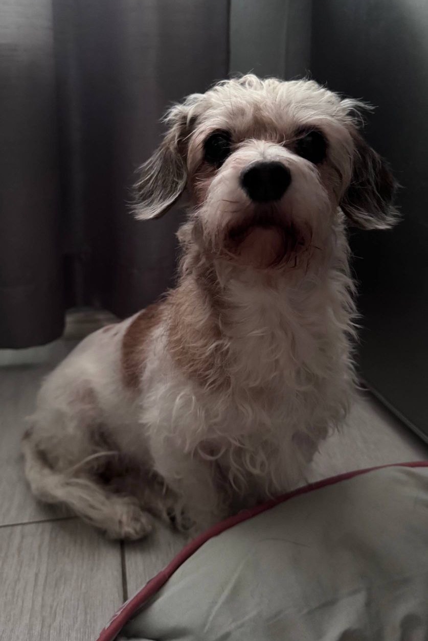 Девочка, маленькая, белая с коричневыми пятнами. Без ошейника. Дрожала от холода, ела корку хлеба, очень голодная.