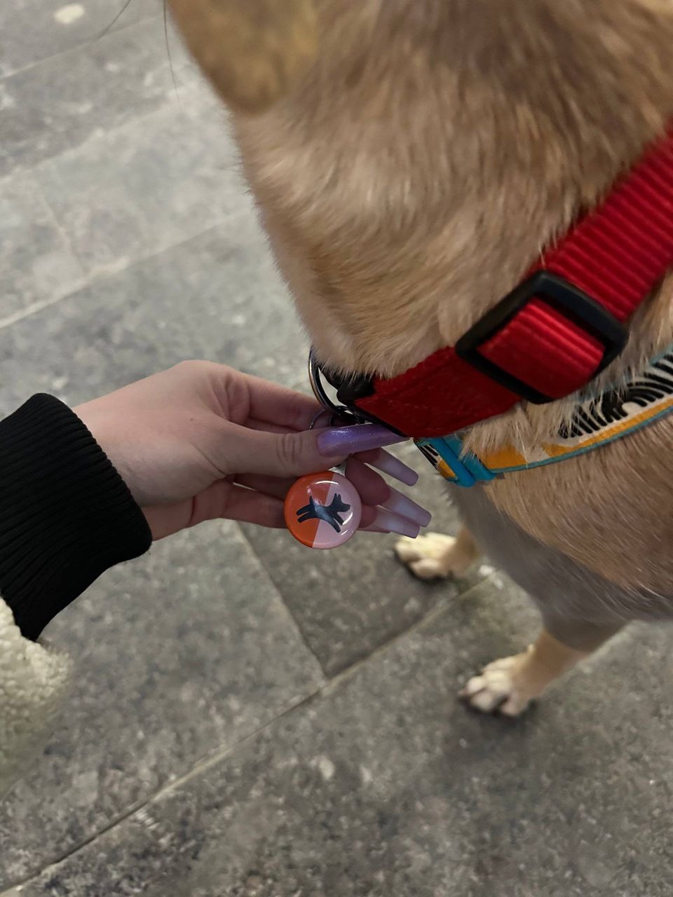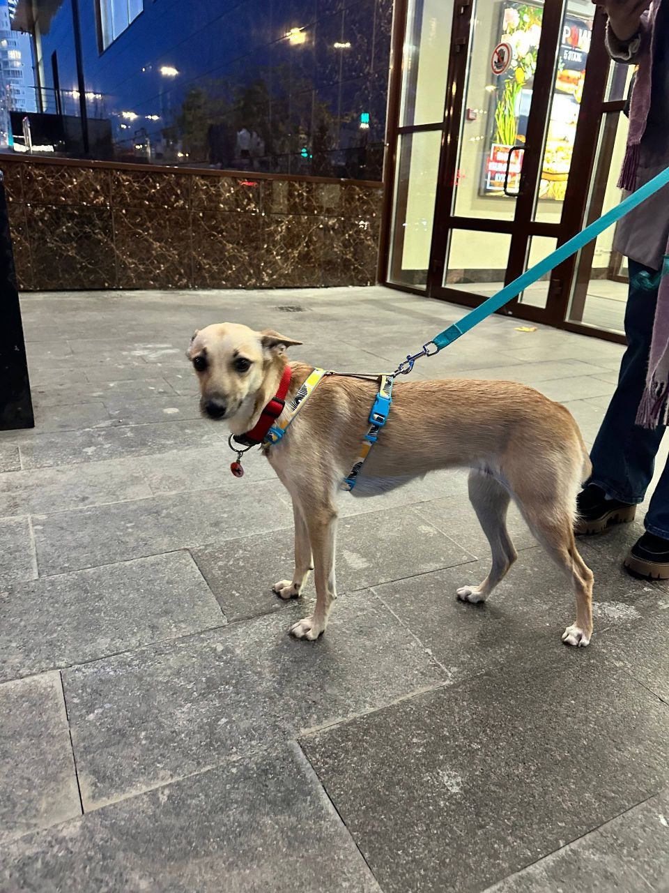 Бежевая девочка, по виду дворняжка, но домашняя с красным ошейником и адресником от 4 лапы