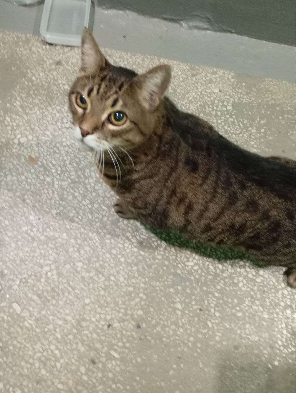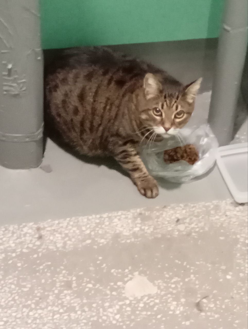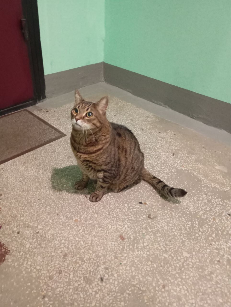 Найдена взрослая кошка (с большим животом, по виду беременная), окрас обычный серо-коричневая полосатая, чистая, по виду домашняя, никаких ошейников, бирок, трекеров нет.