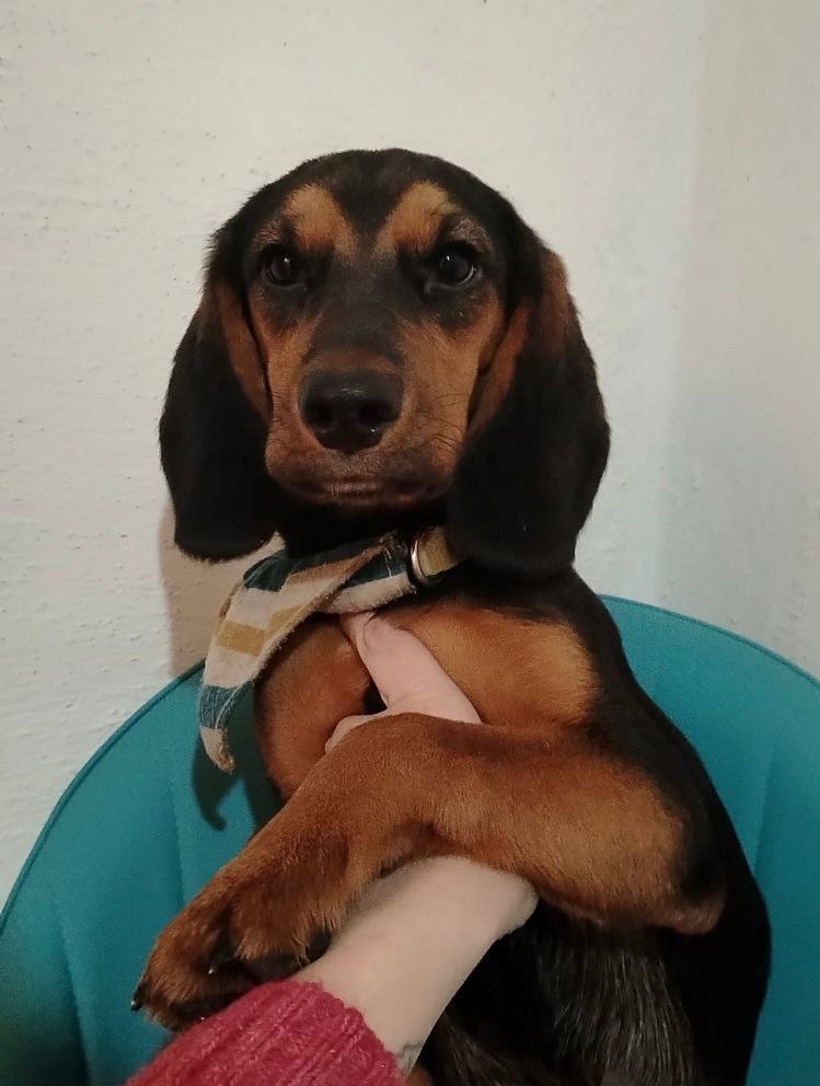 Щенок 7 месяцев. Метис бигля и спаниеля, похож на таксу с длинным ножками, зеленоватый ошейник со слюнявчиком. Осторожная.