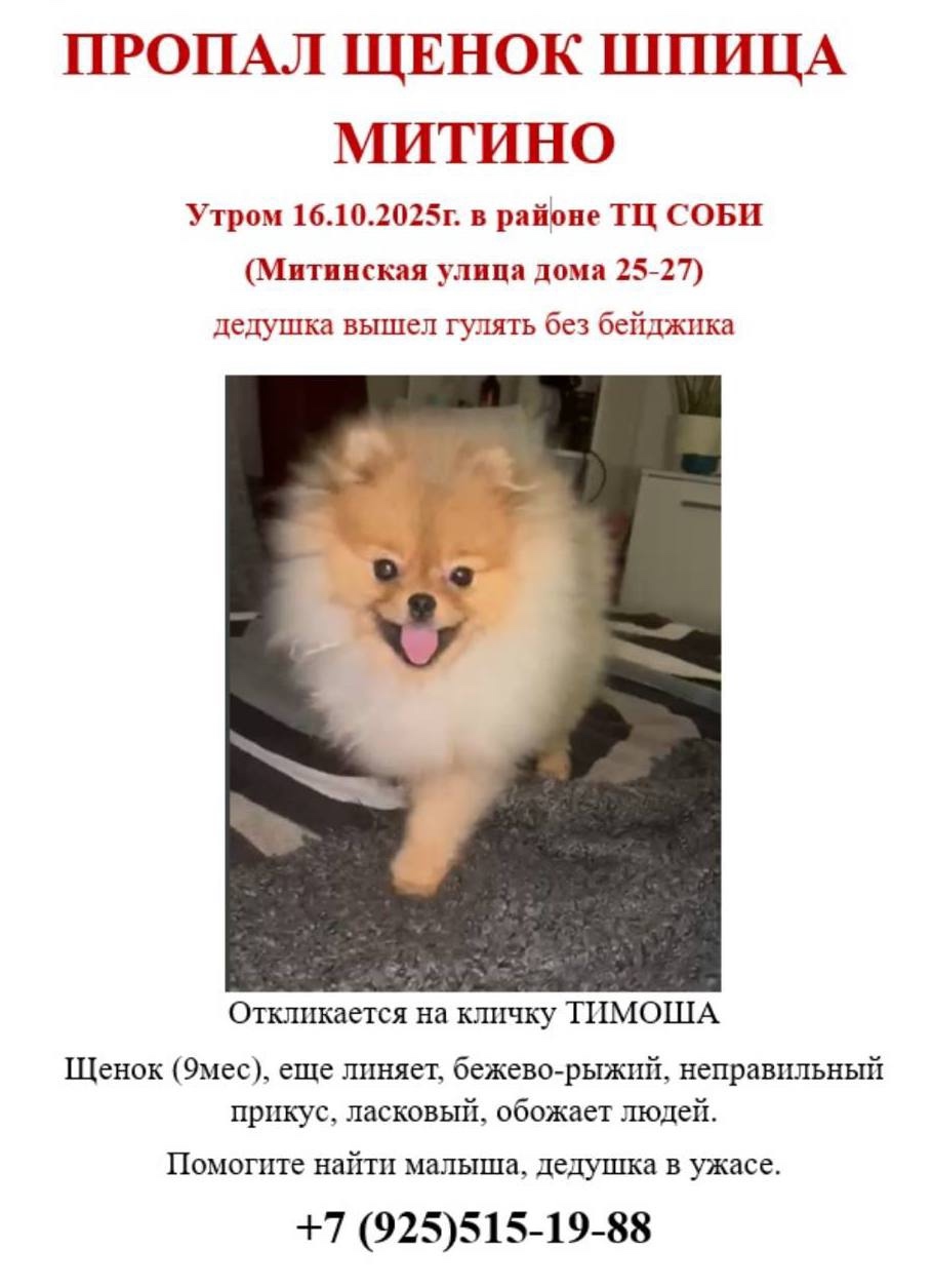 случилось чп , у пожилого дедушки убежал щенок, отзывается на тимоша, тима! в районе дома митинская 25, не может найти , вдруг кто-то увидит его, сообщите мне по номеру, пожалуйста!🙏🏼 +7 (925) 515-19-88