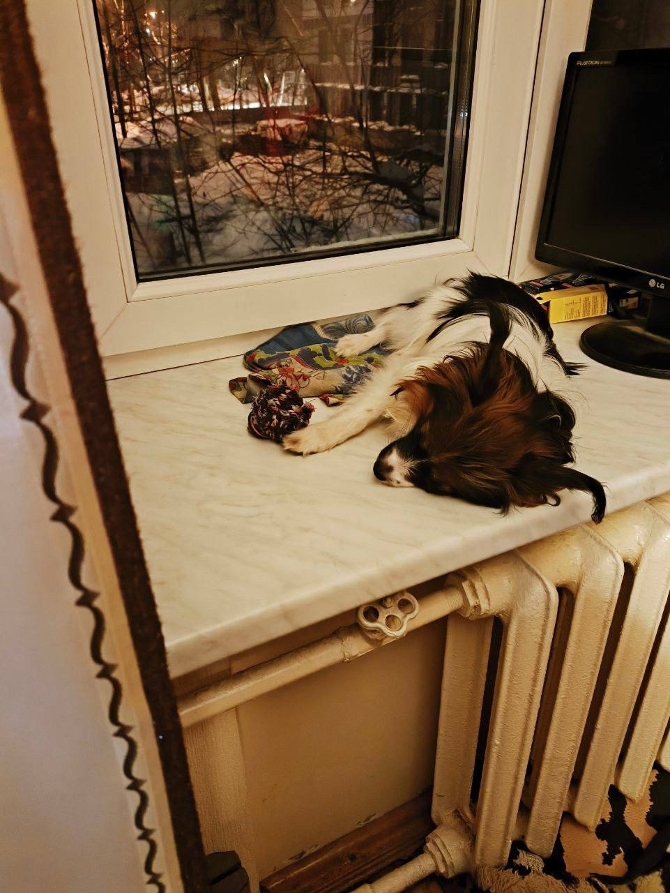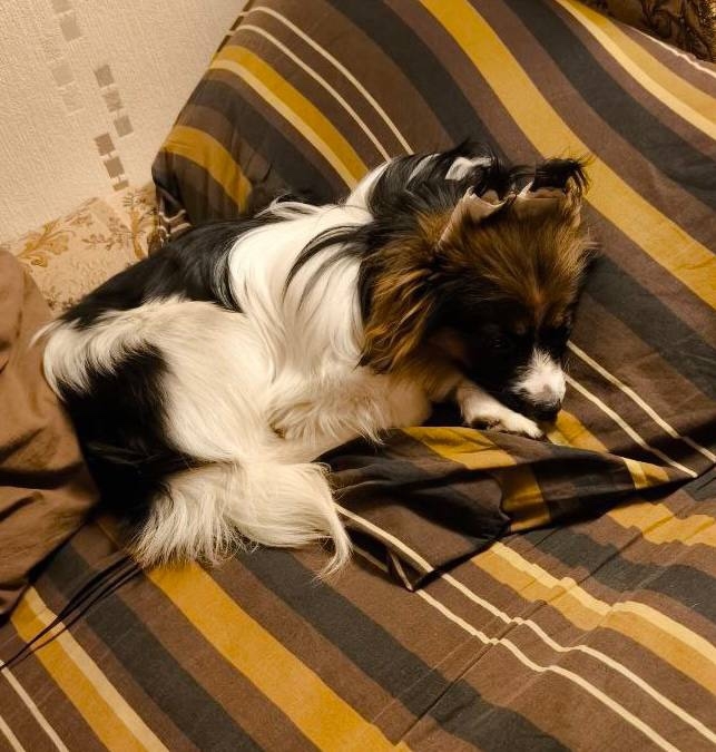 Пропала собака породы папильон. Окрас черно- бело- рыжий. Надето шлейка, ошейник , ошейник от блох.