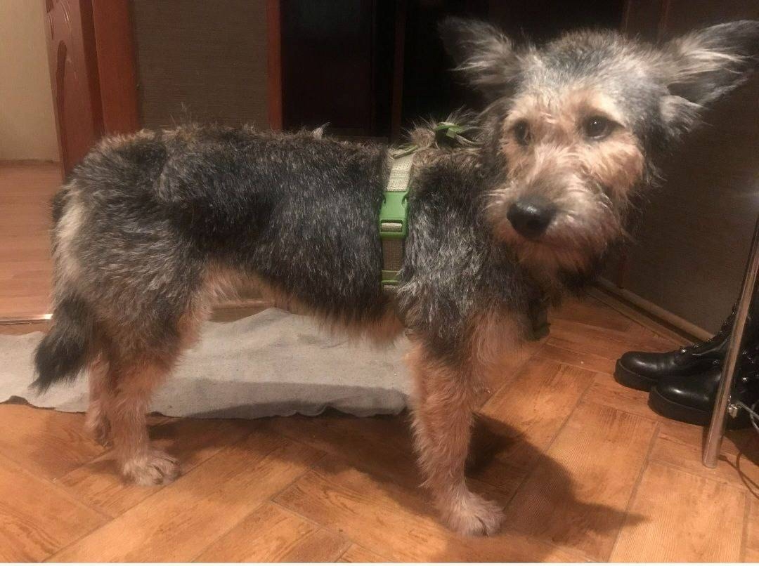 Пропала Собака Марта. Ростом до колена, серая, лохматая. На ней была зеленая шлейка, как на фото. Убежала от взрывов салюта. Очень пугливая. Но за едой подойдет.