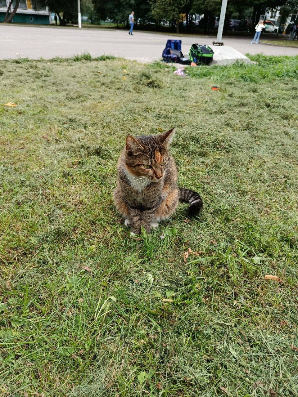 Кошка трехцветная, по повадкам домашняя, упитанная. Как будто недавно оказалась на улице. Дети-школьники подкармливают, если пытаются погладить- кошка огрызается, пытается укусить. Никто не терял?