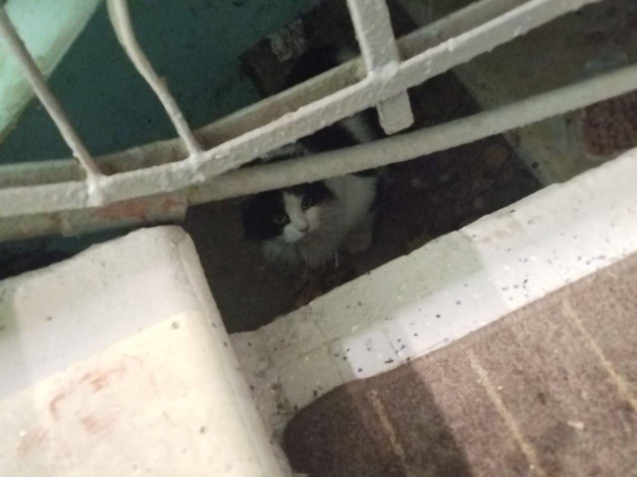 В подъезде дома обнаружена новая кошка/кот, пугливая,на контакт не сильно идёт. Черно белая ,пушистая .