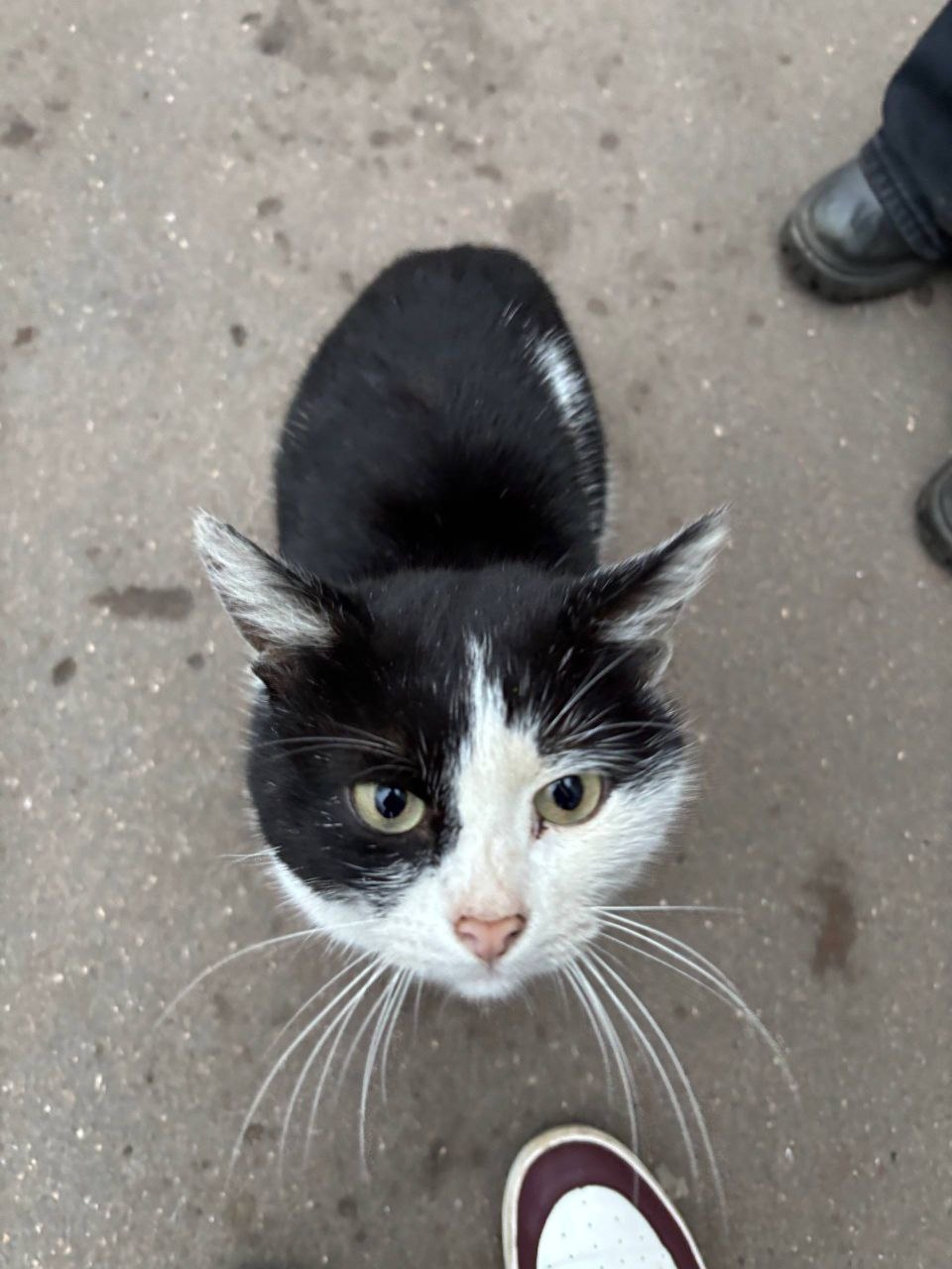 Белый кот с чёрными пятнами очень яркие зелёные глаза, кот очень ласковый постоянно просится чтобы его гладили, не кастрированный и немного грязный