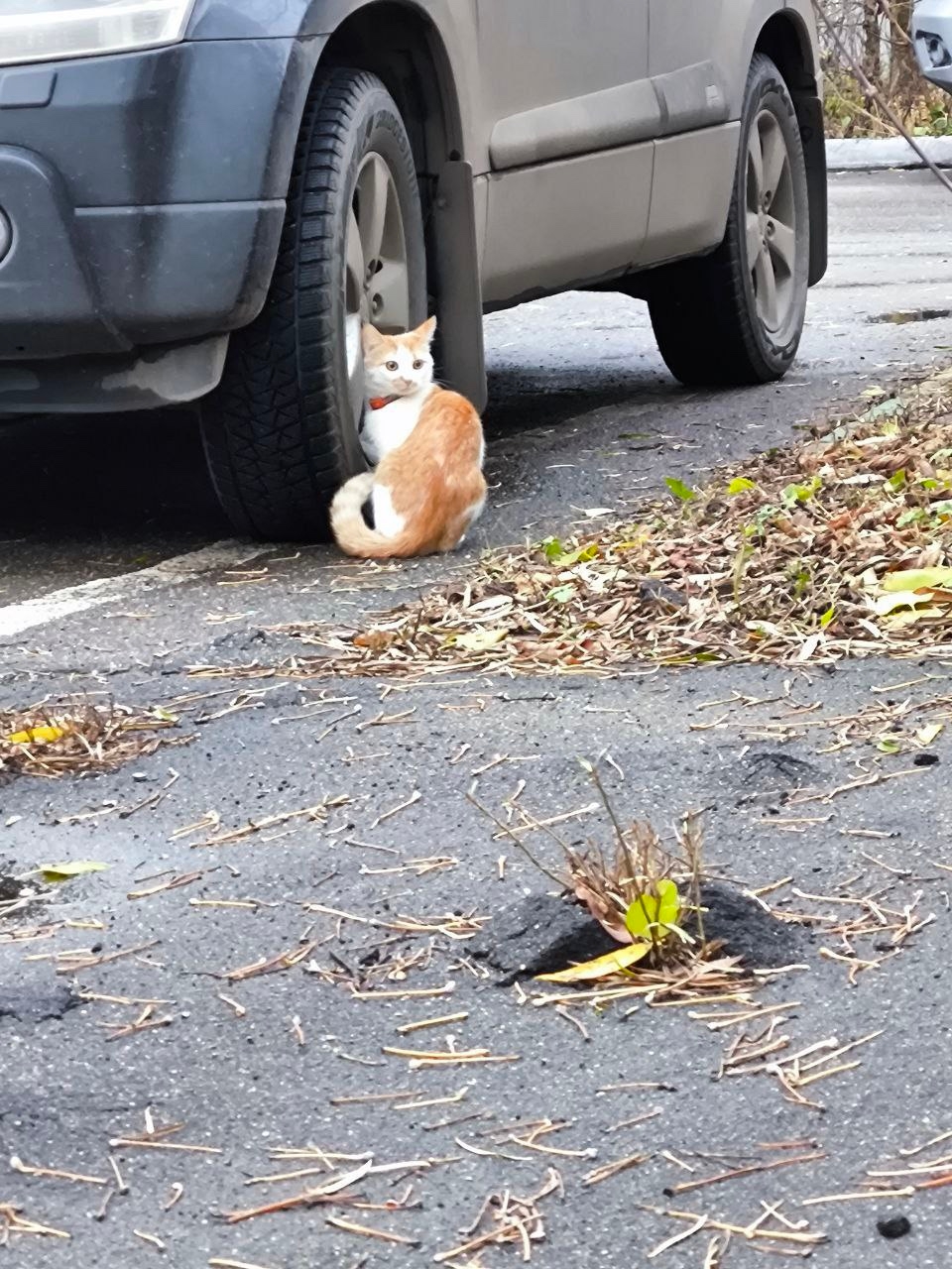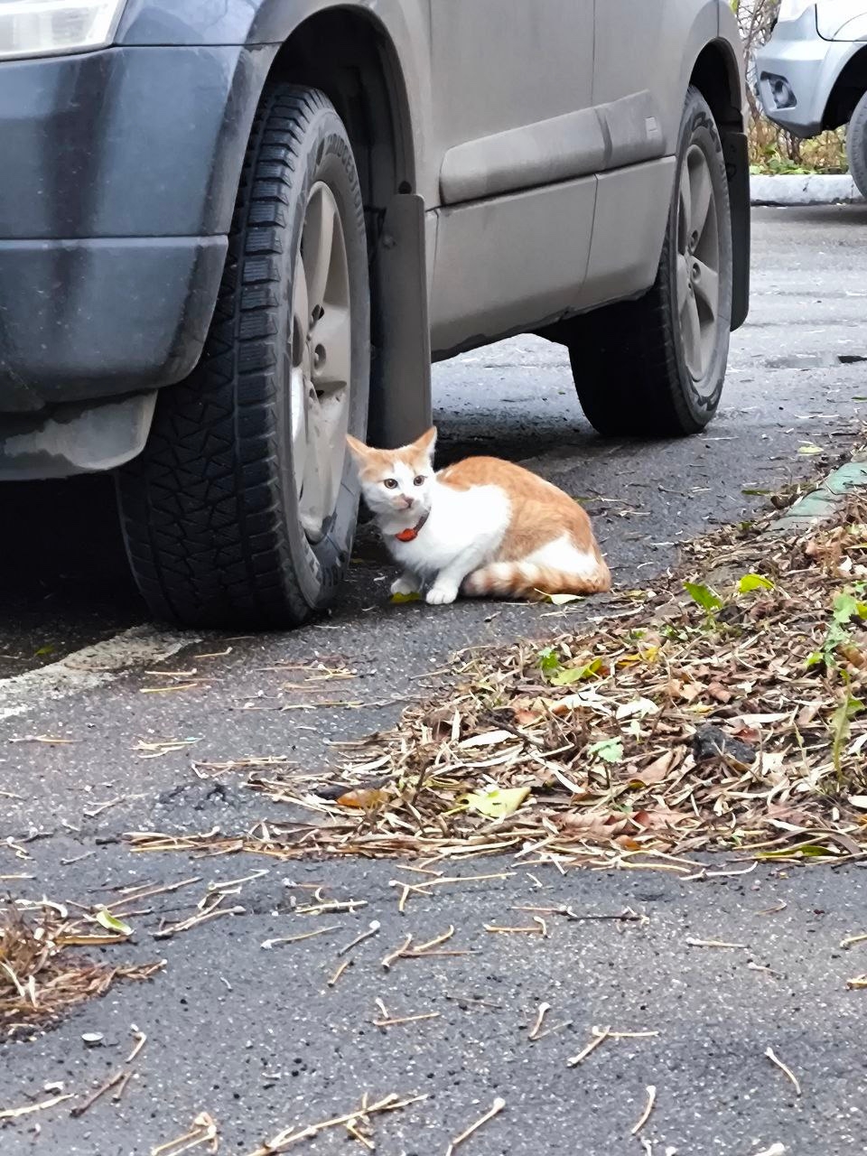 Предположительно кот, окрас рыжий с белым, коричнево-красный ошейник