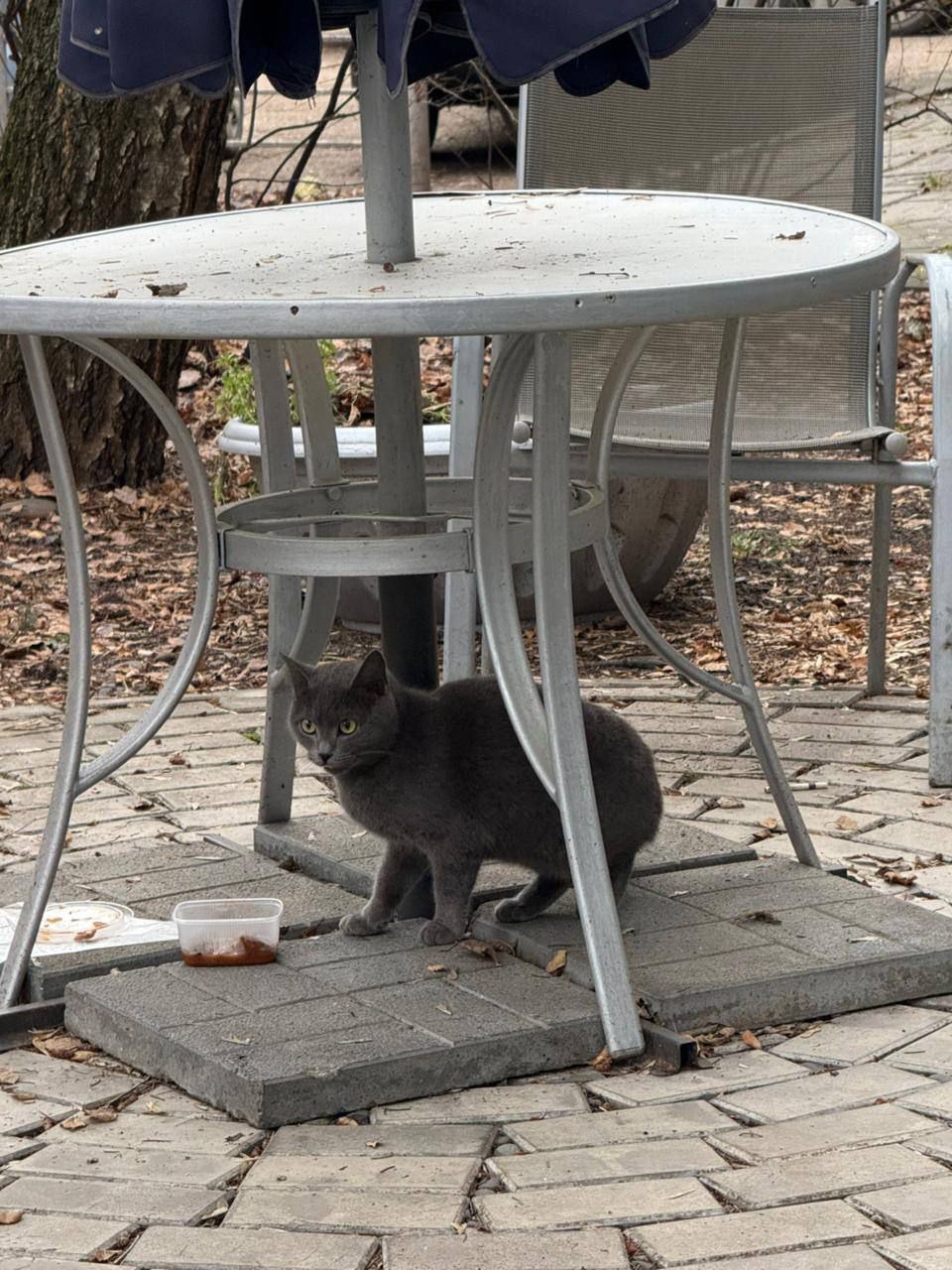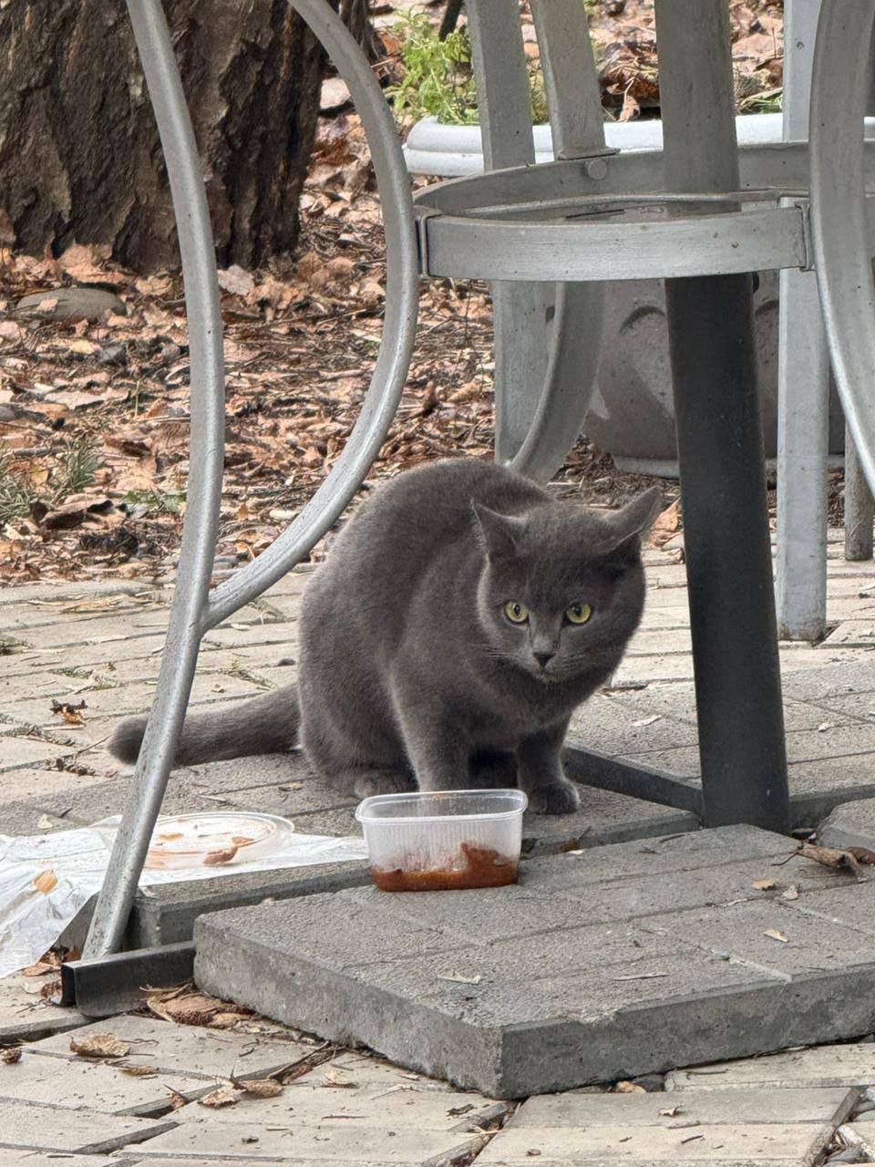 Повторно. Котик приходит на место прикорма, скоро холода, помогите пристроить, может найдутся хозяева прежние 🙏Серый, пугливый, прячется под машинами, на вид молодой.