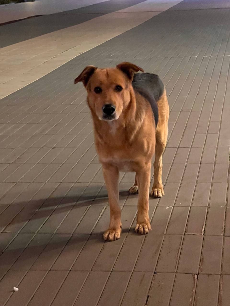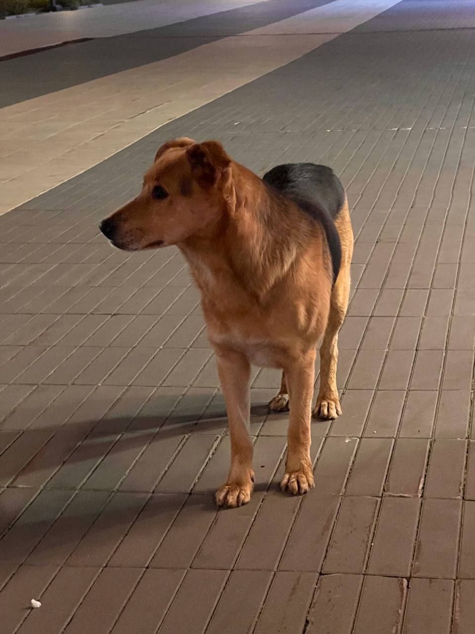 Добрый, не агрессивный прекрасный пёс, золотистый с черным без поводка. Мальчик, на еду облизывается и идёт кушать.