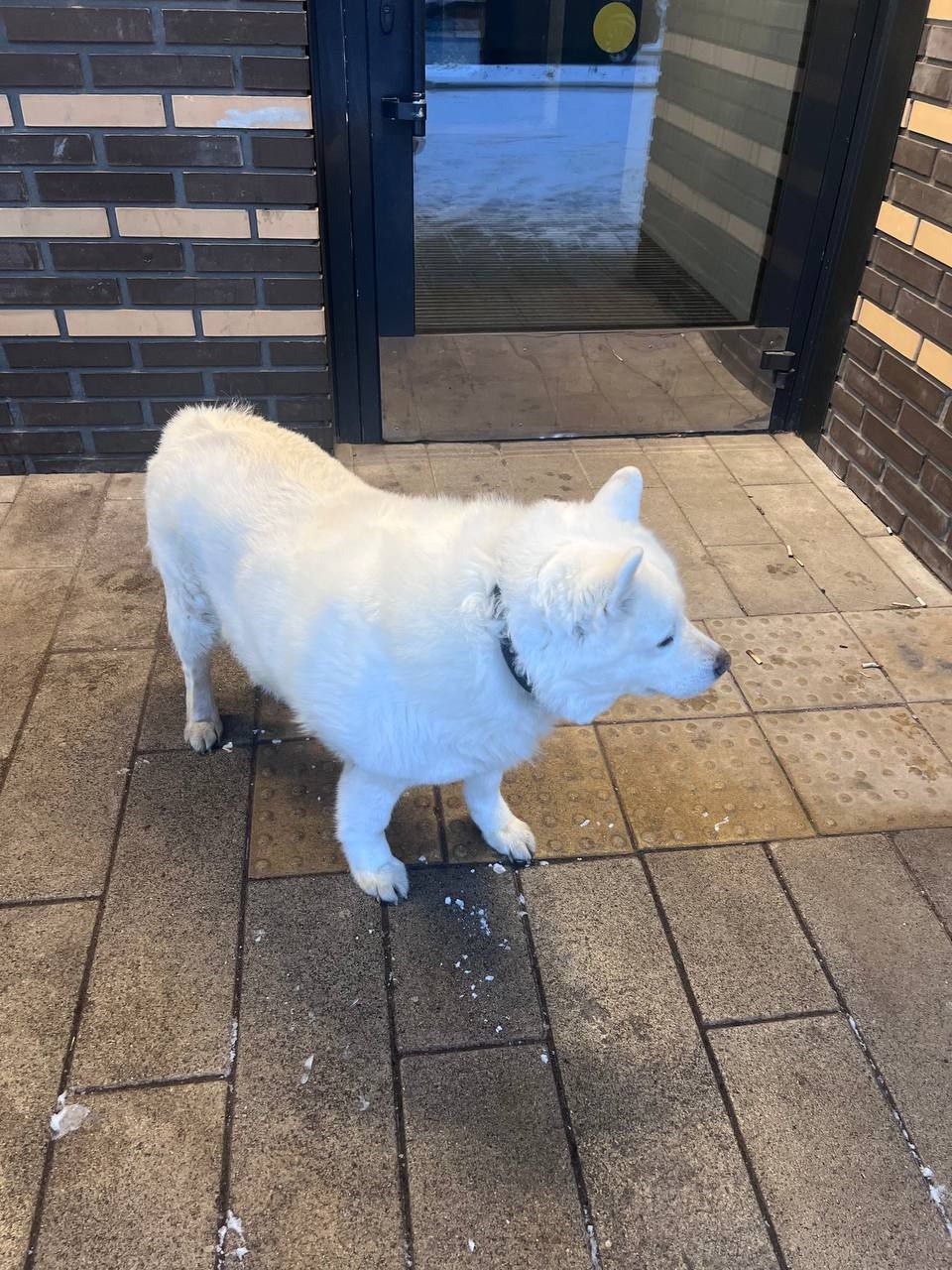 большая, белый окрас, пушистая, есть чёрный ошейник