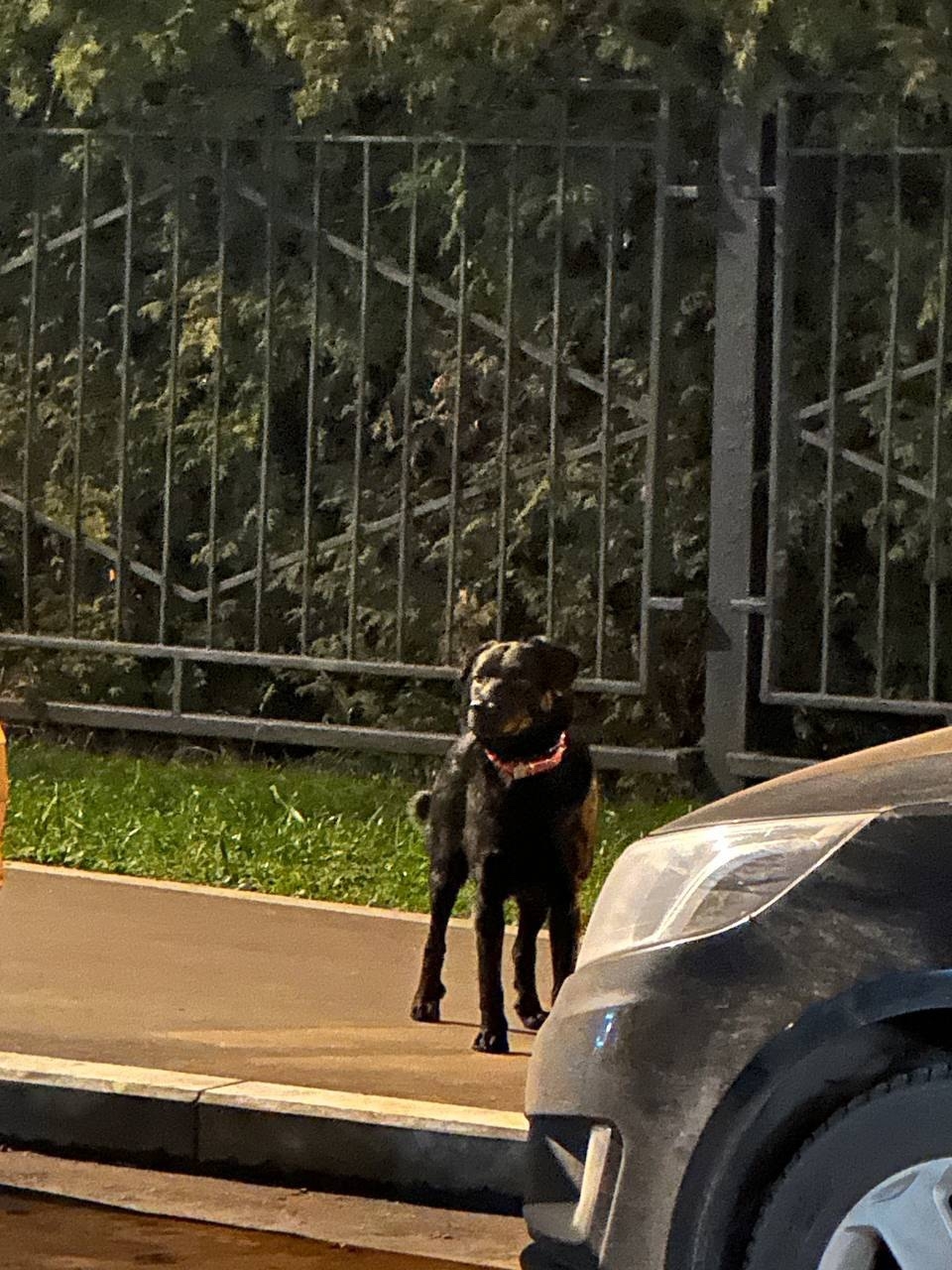 Черная собака, небольшого размера около 20кг на вид, висячие ушки, красный/коричневый ошейник, вроде бы мальчик.