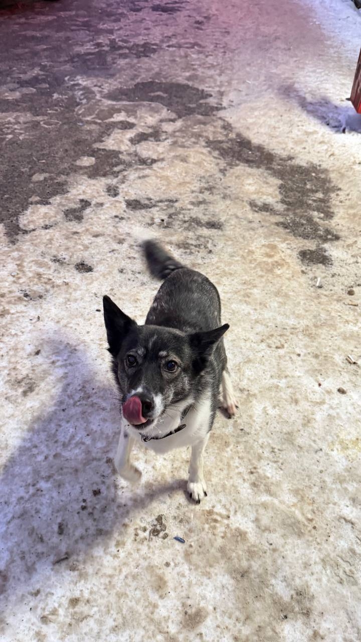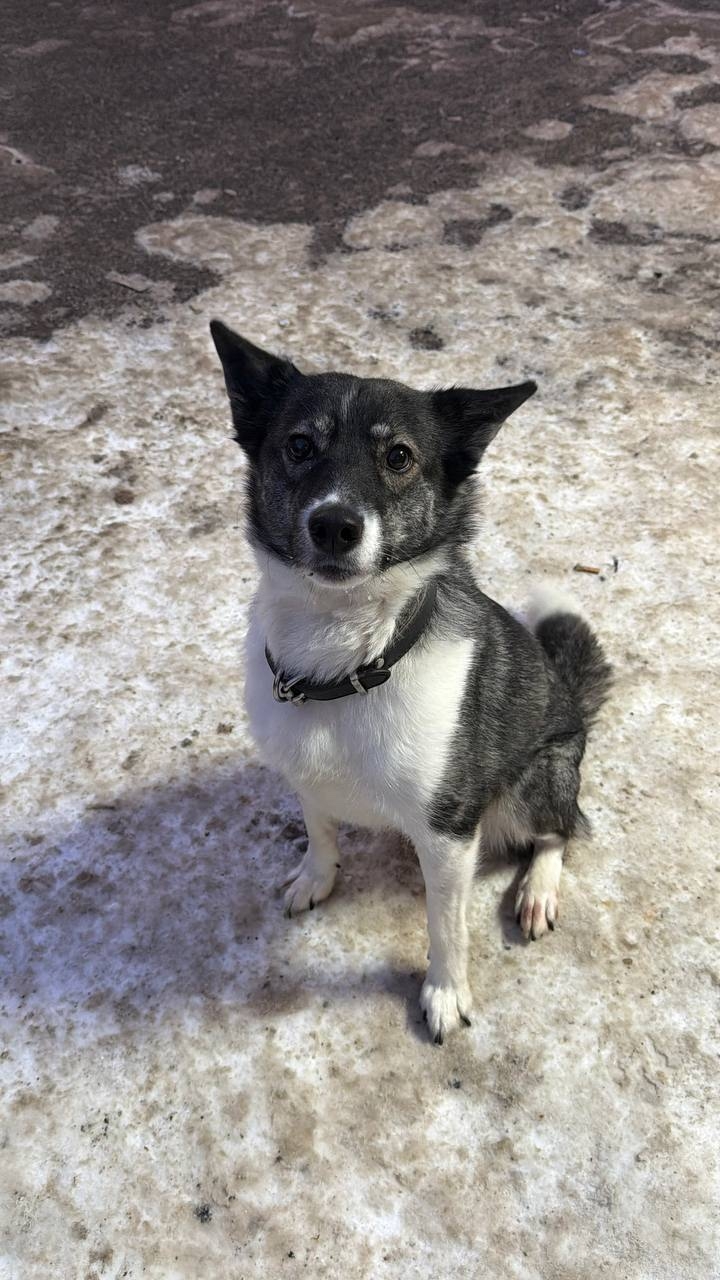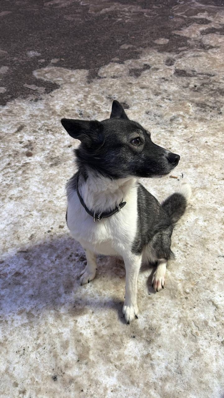 Девочка в ошейнике без адресника. Окрас серо-белый, размер по колено