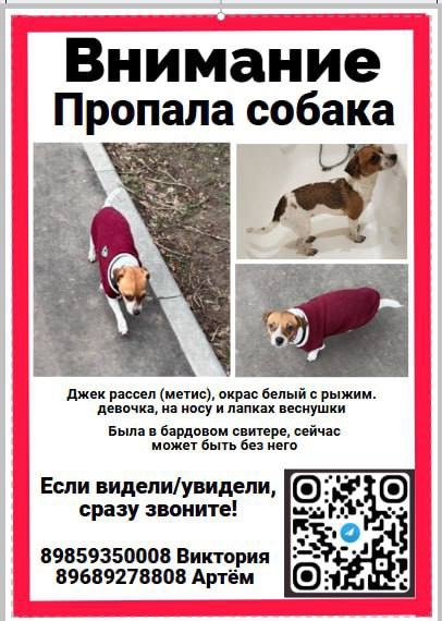 Метис ДРТ ( Джек Рассел терьер ), худенькая, некоренастая. Лапки худенькие, как у чихуахуа. Окрас белый с рыжими пятнами.