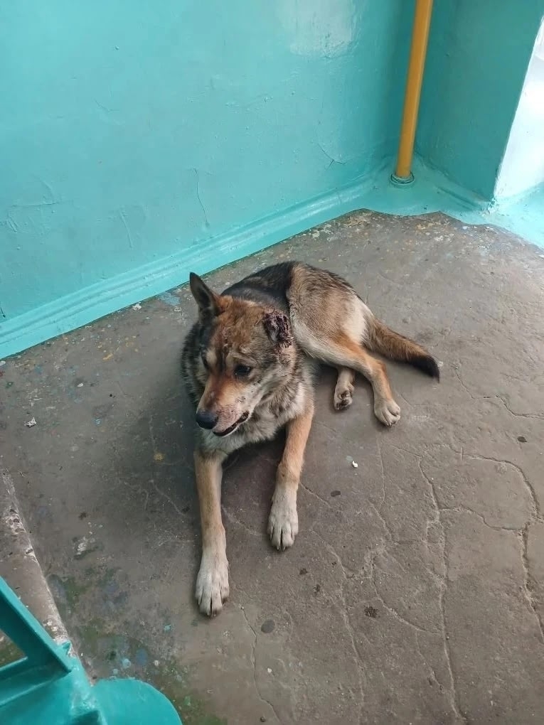 Обнаружен песик, оторвано ухо, сломана челюсть.