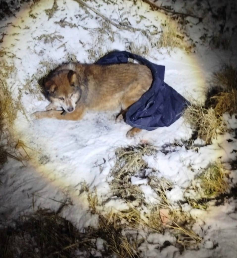 Некто сбил собаку, она жива, но не может ходить, пытались её поднять и унести в тепло, но пытается укусить. Накрыли жилетом…к себе подпускает