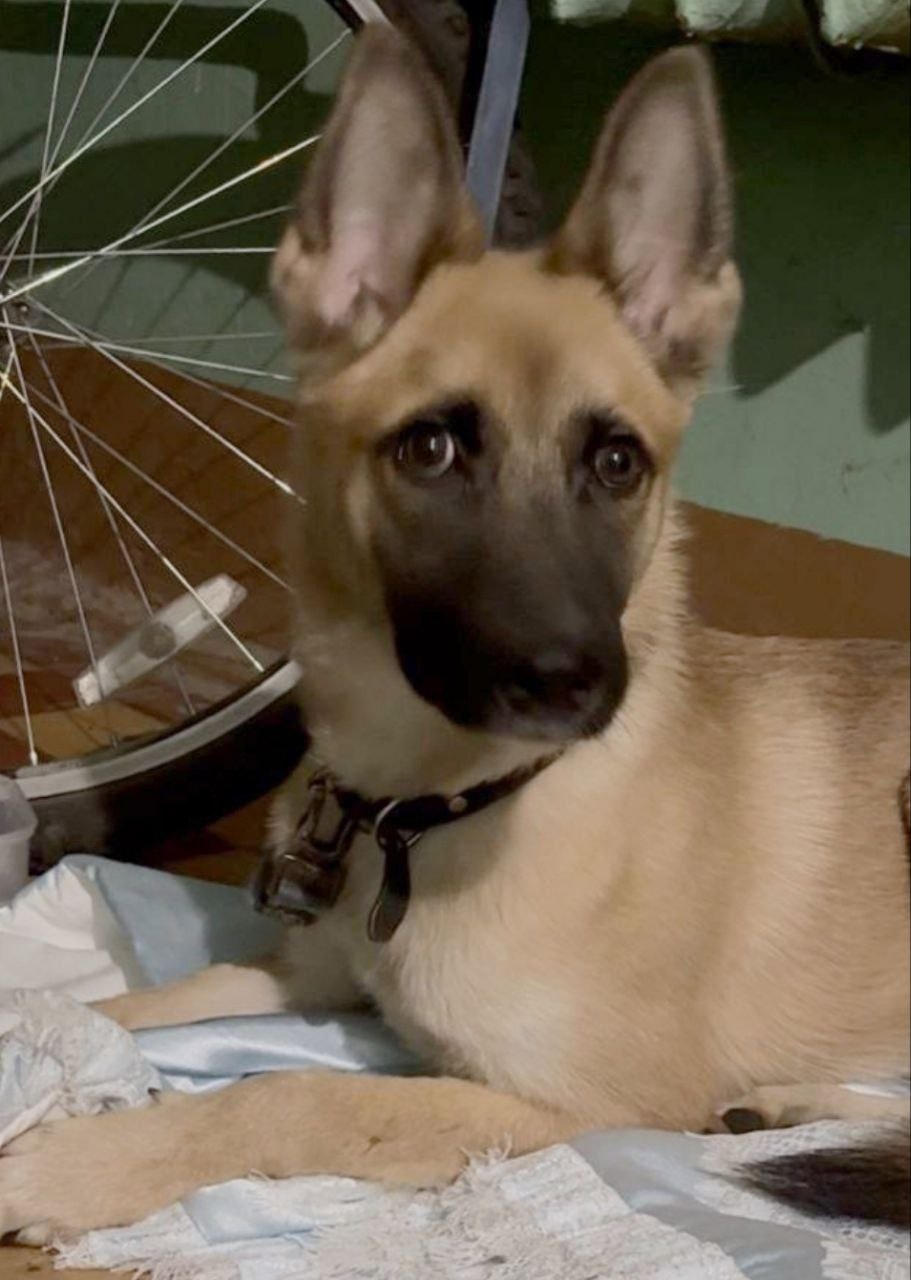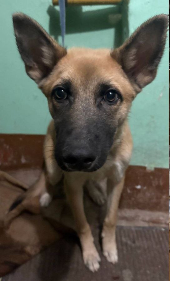 24.01. Рыжий/на левый окрас, с затемнение на морде. Уши стоячие, в кожаном ошейнике с металлическими сферами.