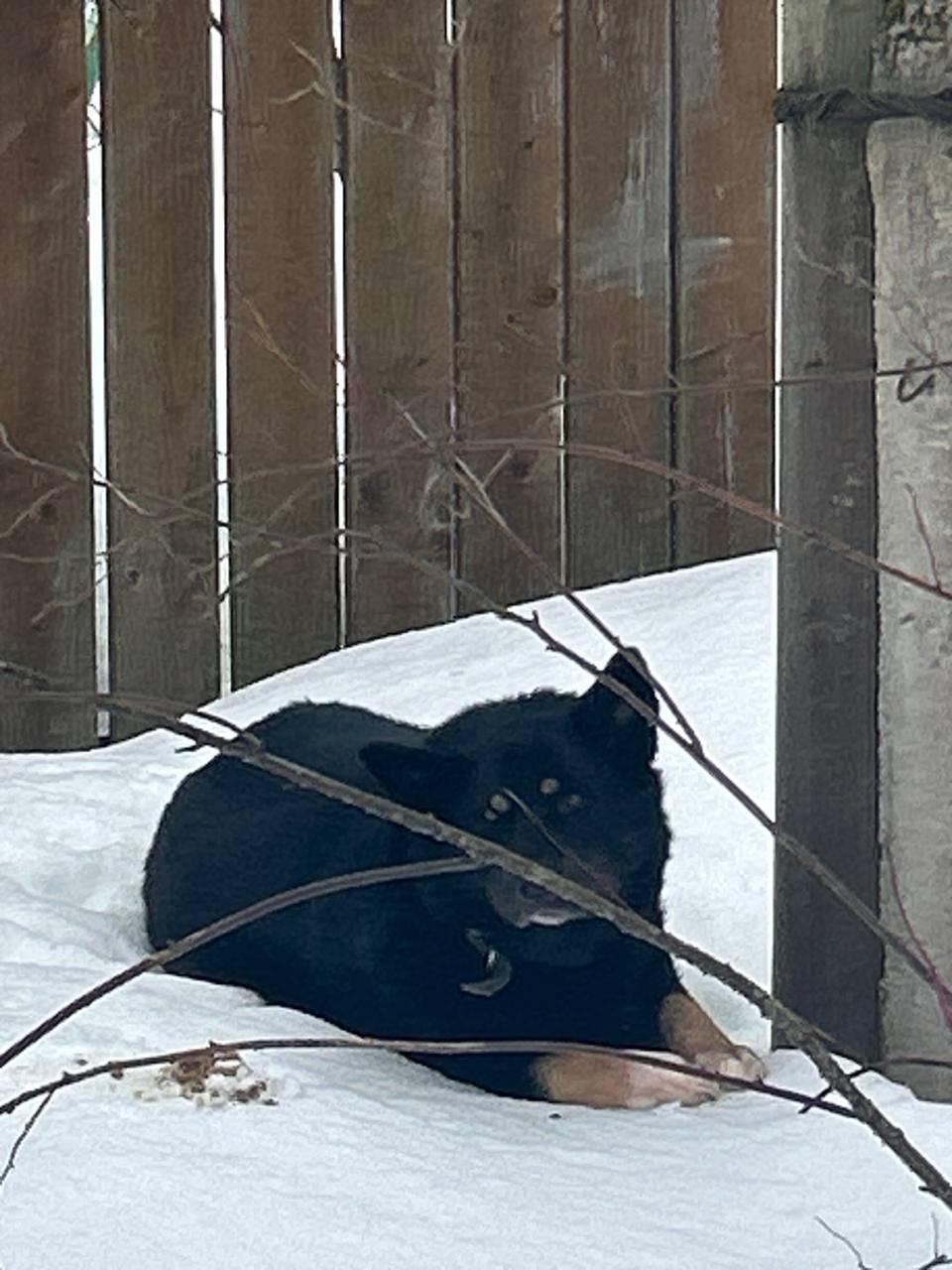 На 5ой Советской рядом лежит собака с ошейником под забором, возможно ранена