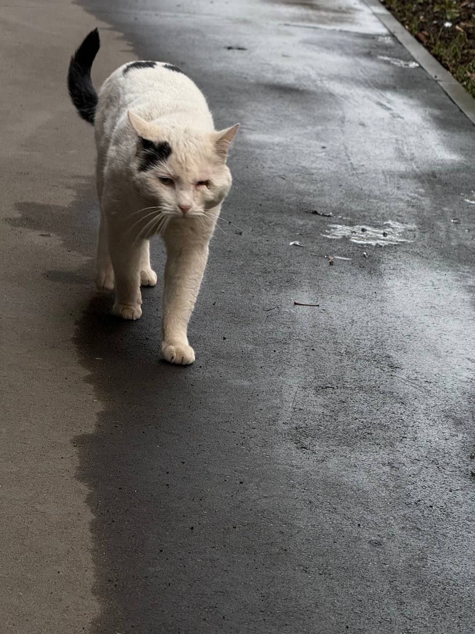 Выживает на улице. Уже заболел. Бросается под ноги к прохожим.
