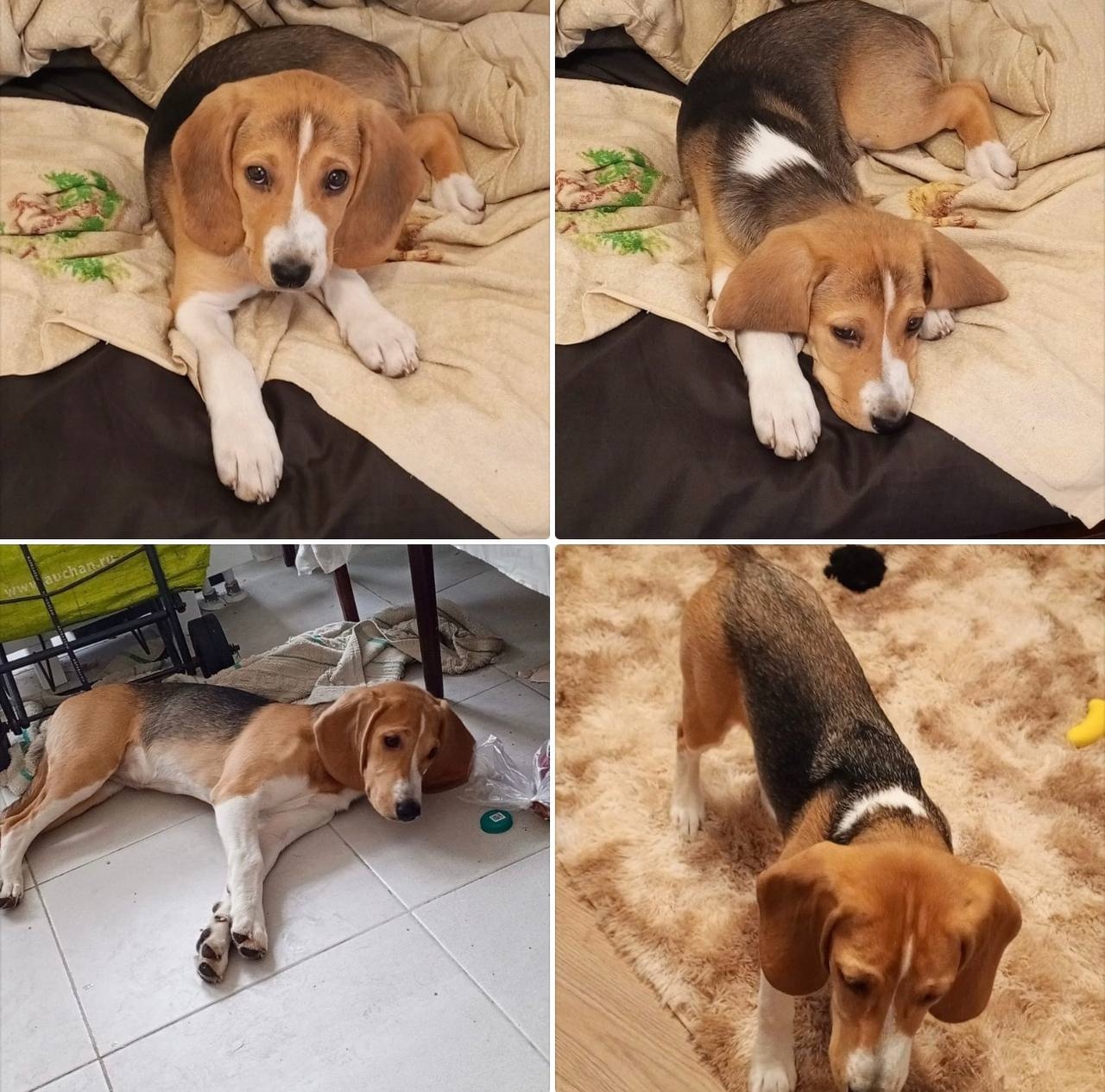 · Молодая собака, окрас напоминает таксу или маленькую гончую.