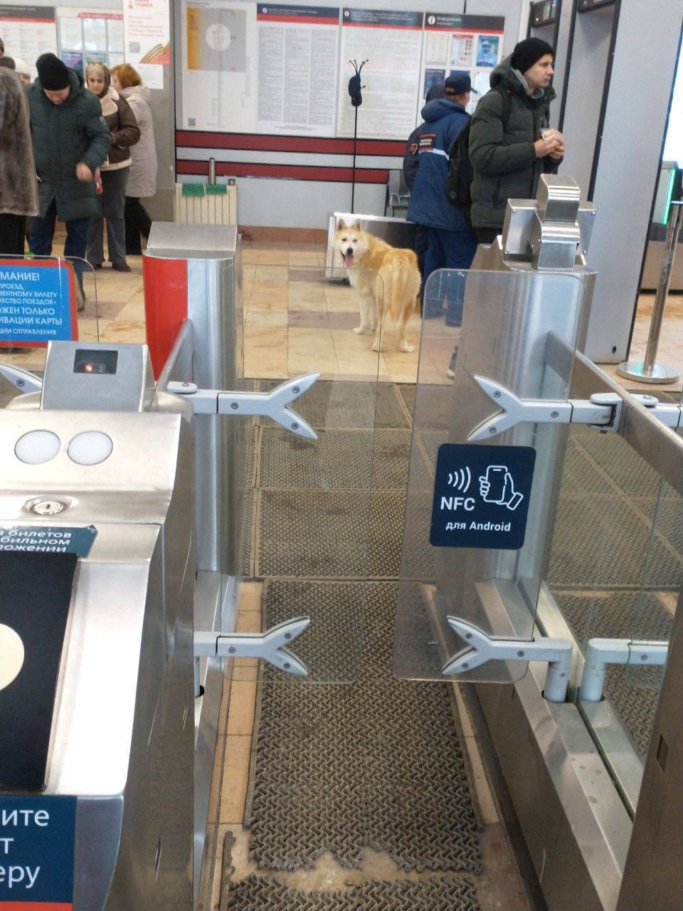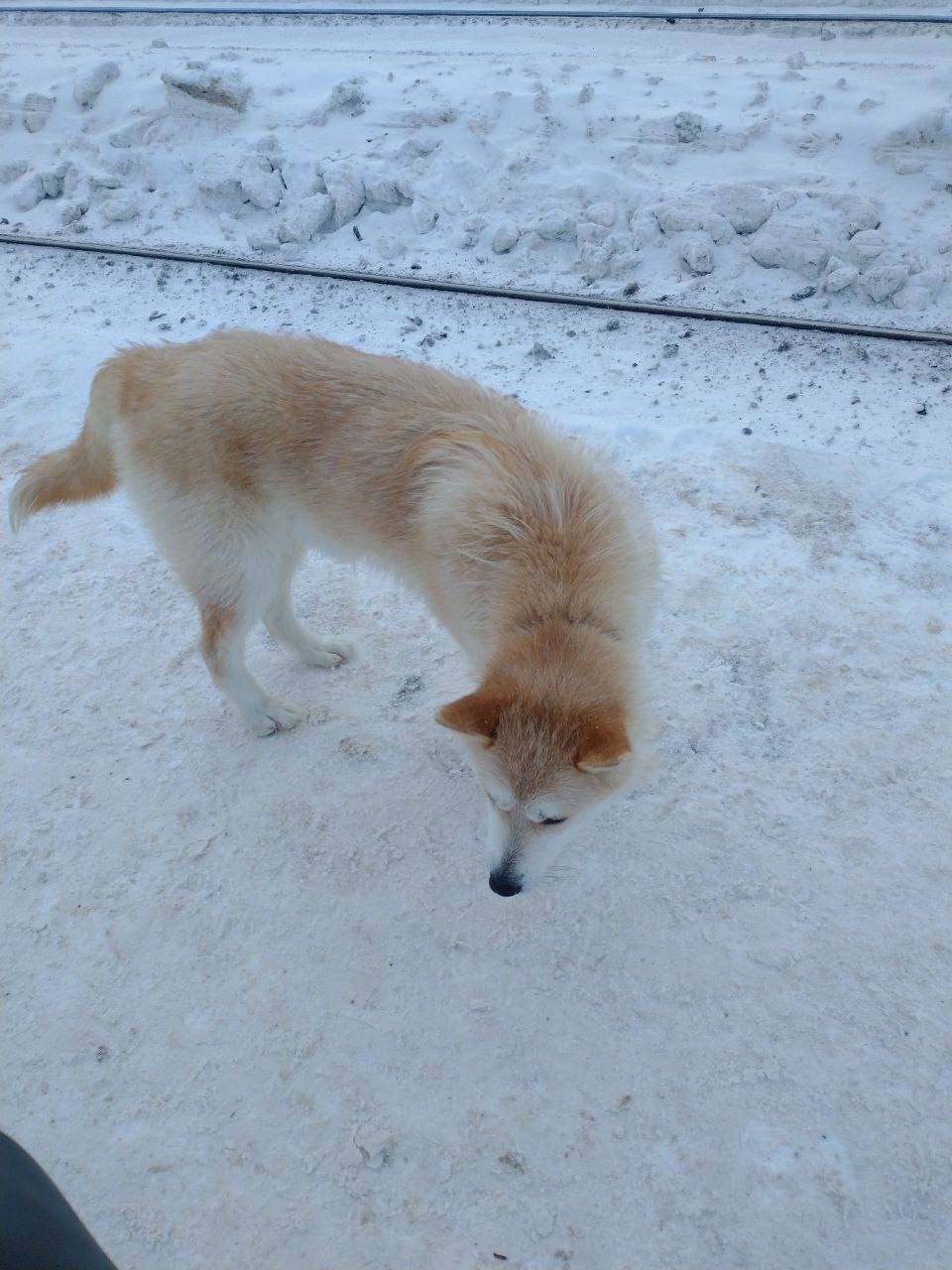 На станции пёсик. С ошейником, адресника нет. Хотел сесть в поезд. Наверное, так и сюда приехал.