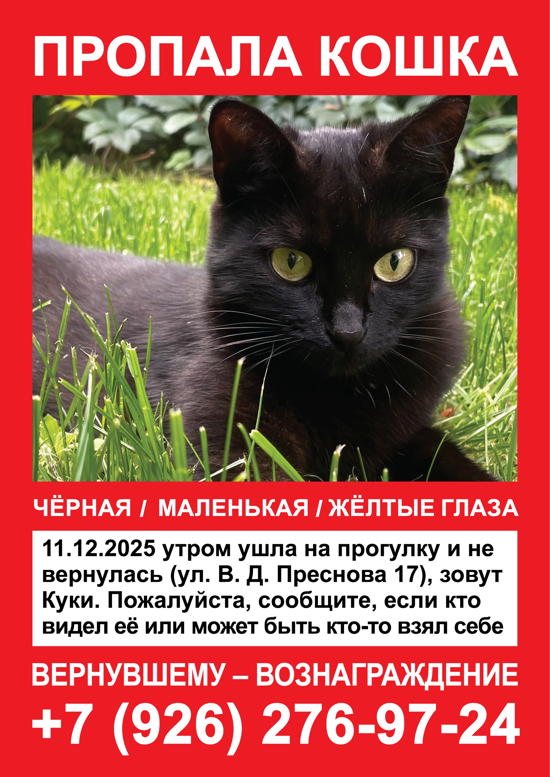11.12.2025 рано утром ушла гулять и не вернулась, зовут Куки. Стерелизована. 2 года, черная, маленькая кошечка с желтыми глазами и длинными лапами. Очень пугливая, нервная и капризная, с трудным детством – подобрала котенком еле живую на обочине.