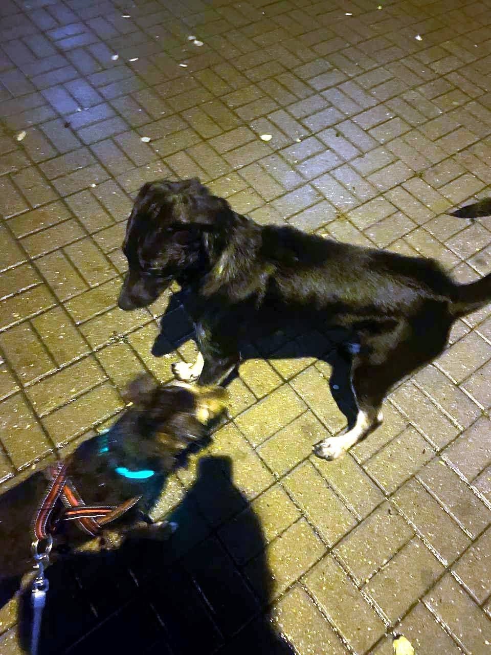 Придержать не смогла, гиперактивный, убежал от нас к другим собакам, людьми вообще не интересуется…