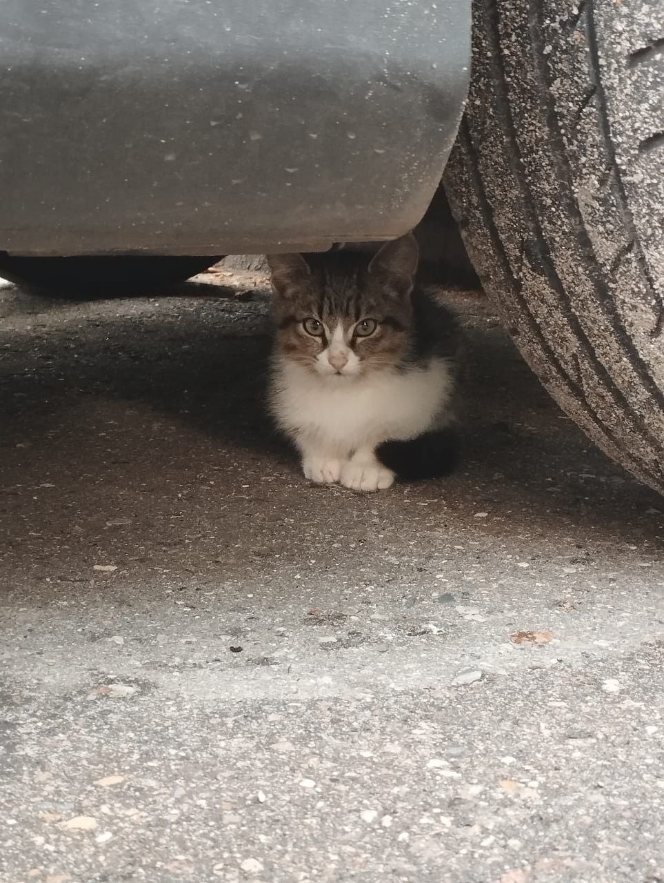 Ул. Строительная, опять выбросили кошку с котенком, видно что домашние, кошка бегает за людьми, мяучет, просит помощи. Котенку месяца два, мальчик.