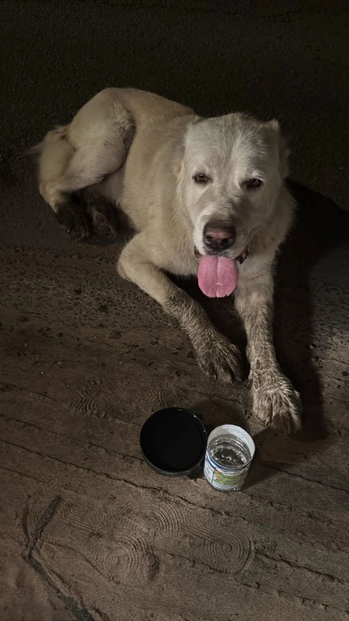Алабай белый вдоль дороги, спокойный, не могу сказать девочка или мальчик.