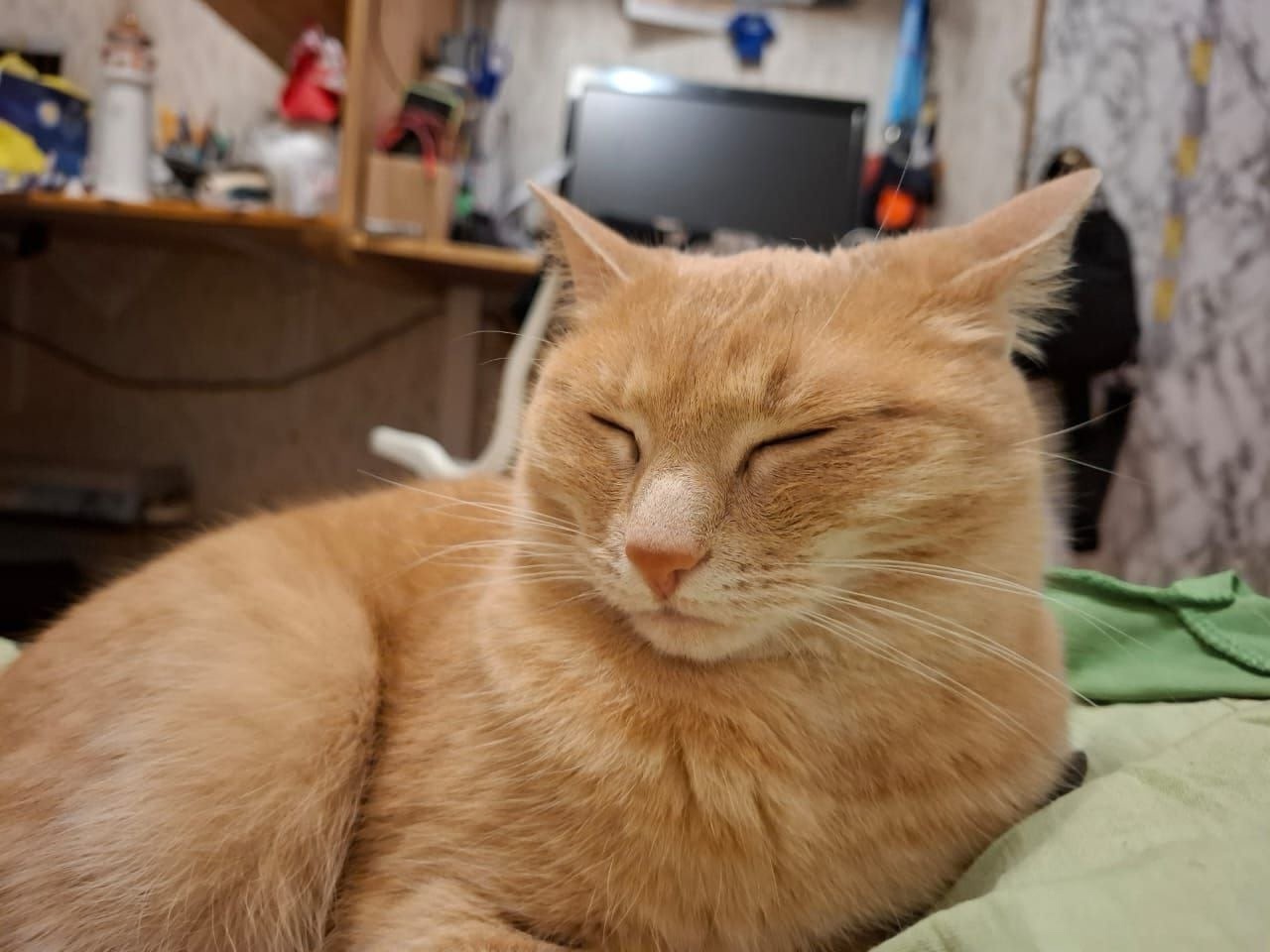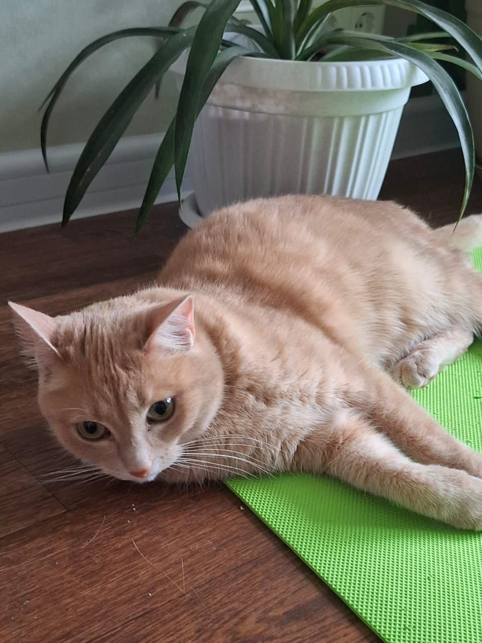 Цвет рыжий, глаза зелёные. Сломан самый кончик хвоста (на ощупь можно определить), сломан давно, с такой травмой подобрали.