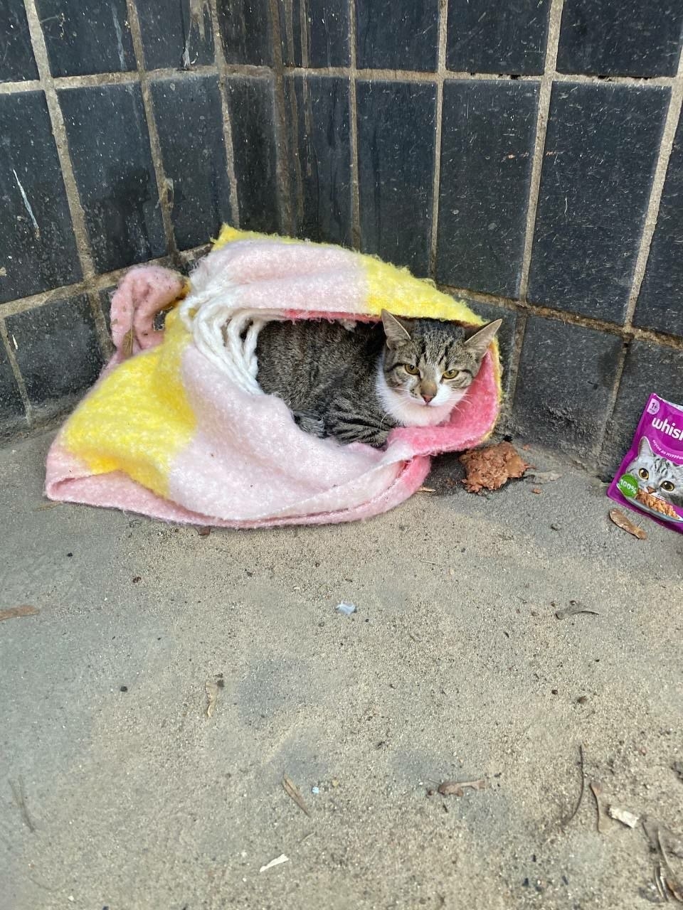 Нашли кота, окрас полосатый с белым (шпротик) с утра 26.03.2026 завернутого в шарф. С утра был ласковый, но к вечеру у кота начался стресс и перестал подпускать к себе.
