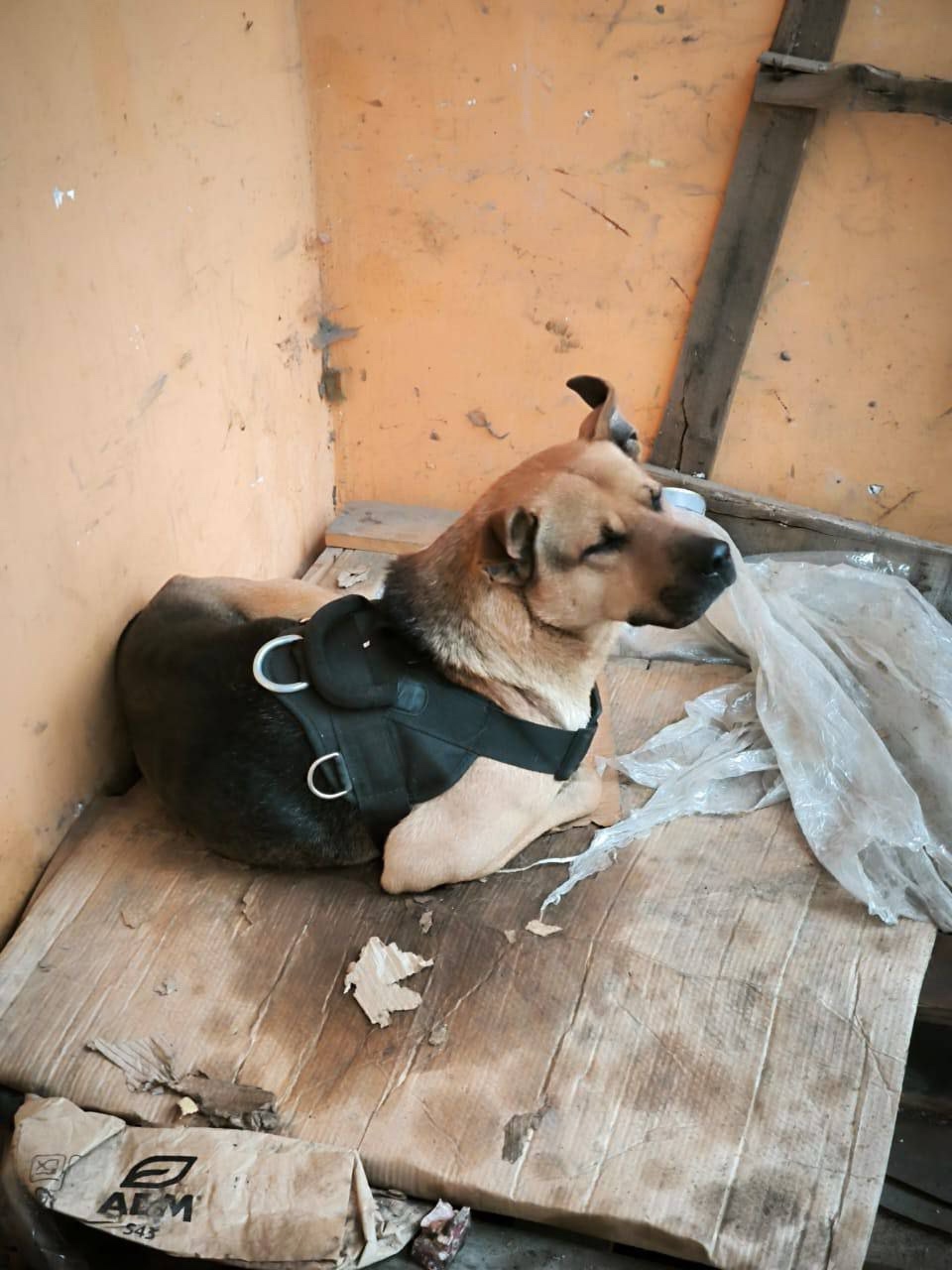 ХИМКИ!!!!Соседи, тут недалеко от наших ЖК у мужа на работе к зданию (ул. Рабочая, 2А) недавно прибился пес. 3 дня. Пришел прям с этой шлейкой, проблемы с задними лапками у него. Спит вот на картонке на холоде, худой бедолага. Не видел кто-нибудь объявление о потеряшке в Химках? Жалко его