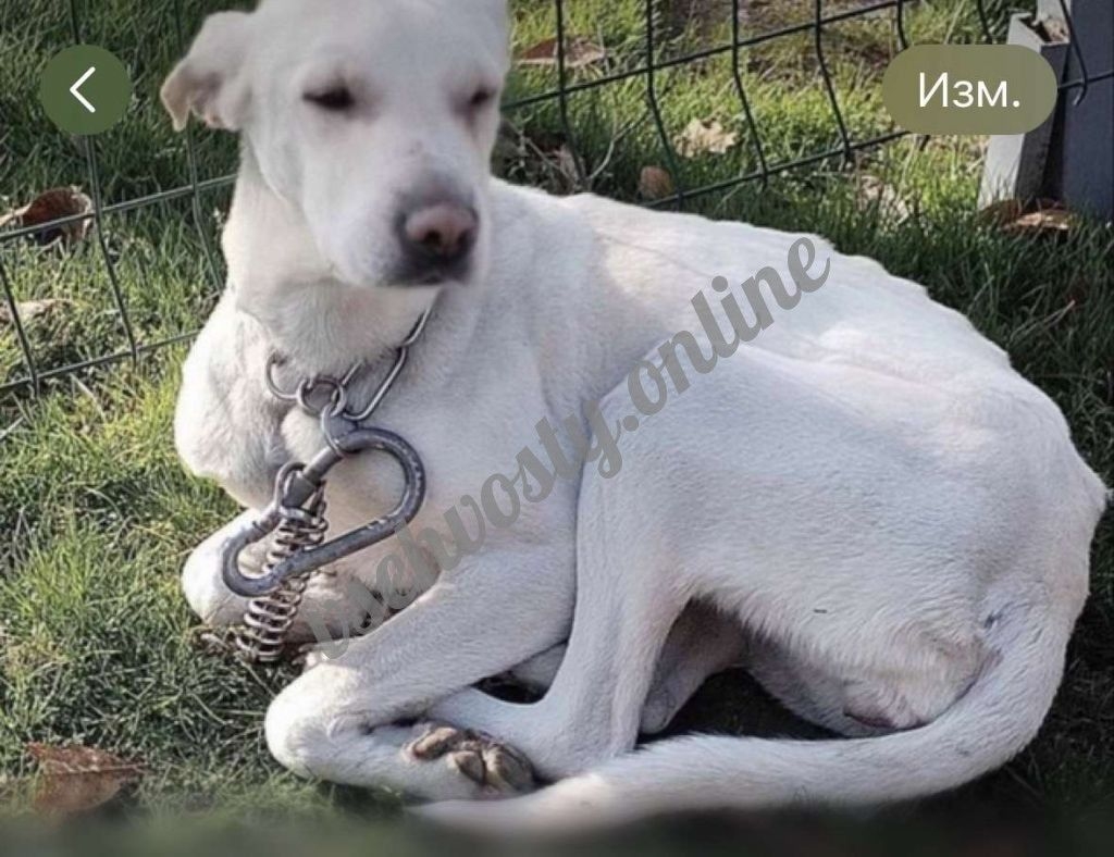 Этот обтянутый кожей скелет нашли волонтёры. Собака была прикована цепью к забору в глуши. Неизвестно, сколько времени она провела без еды и воды.
