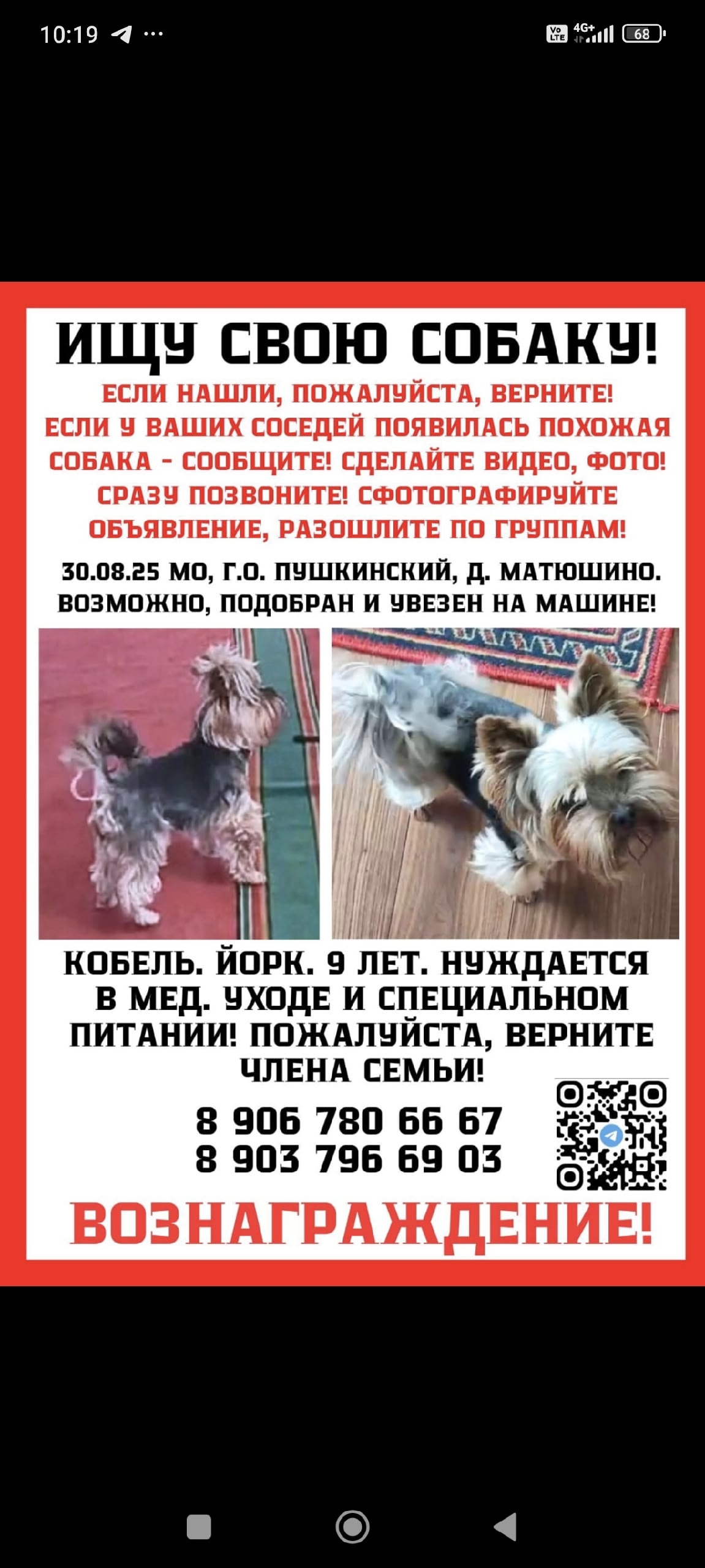 Ищу Йорка. Пропал МО, Пушкинский р-н. Собака на спец уходе. Был увезен на машине. Возможно у ваших соседей, знакомых появилась похожая собака? Не дайте собаке погибнуть, звоните в любое время! Вознаграждение!!!
