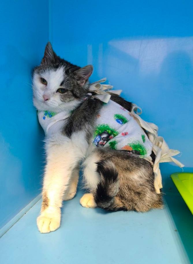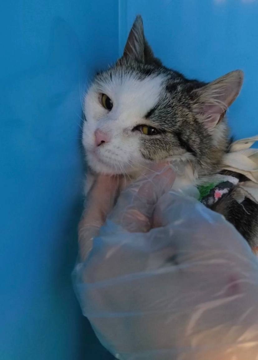 Малышка еще котенок. Родилась около метро, потом мамка перетащила ее и еще 7 котят к гаражам. Сейчас живых осталась только она и сестренка. 2 сбиои машины, 2 замучили дети, еще 2 неизвестно… Мужчина привез хоть стерилизовать, чтобы не нарожали и они сами..