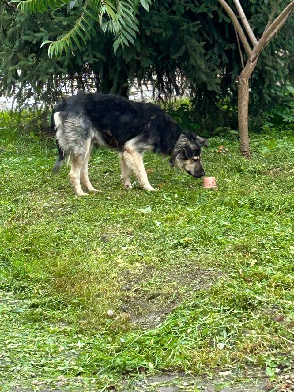 Сука, рост по колено, в широком кожаном ошейнике. Напугана.