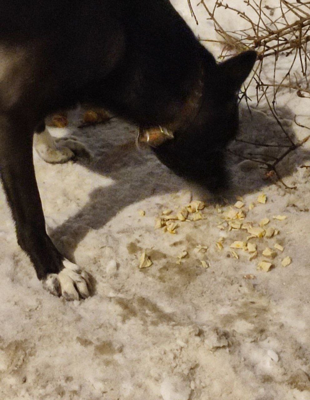 Замечена собака. Чёрного цвета, белые лапы. Есть ошейник.