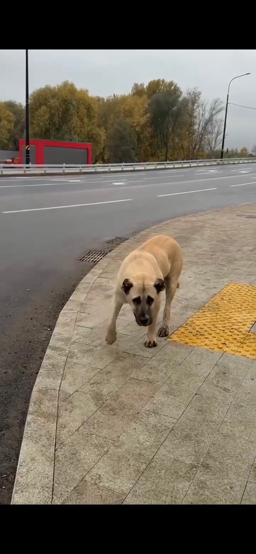 Красивейшая собака породы Кангал каким-то образом  очутилась на стройке. За ней приглядывали и подкармливали строители, но сейчас стройка закрывается. Рабочие разъезжаются и собака остаётся совершенно одна. Вынужденно она скитается по улице уже несколько МЕСЯЦЕВ, рядом проезжая часть, проезжают большие строительные грузовики, куча других авто. Собака переходит через дорогу от одной стройки к другой.