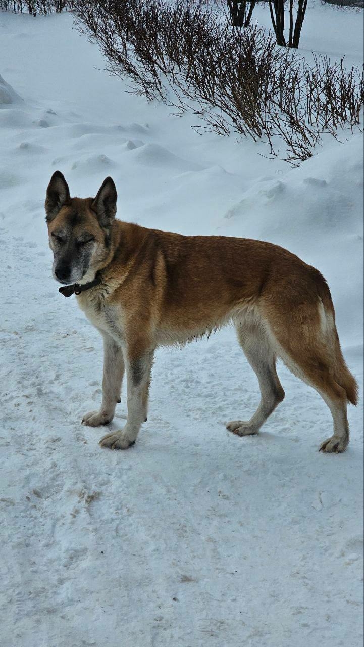 Рыжий с белым окрас, седая мордочка, есть ошейник.