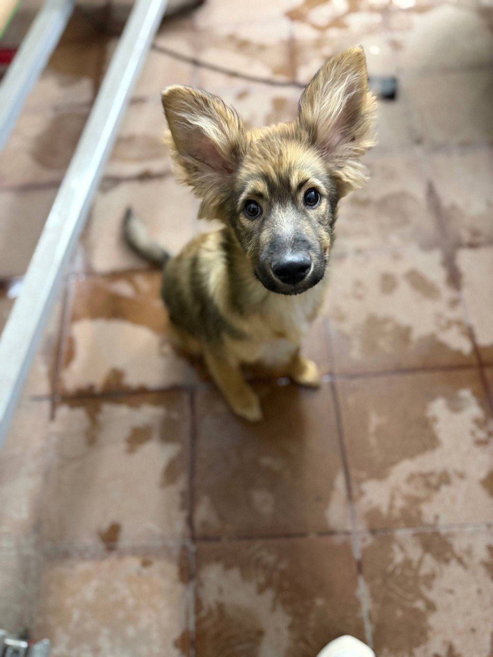 Маленького размера, мальчик. Окрас триколор, невероятные ухи, эффект “маски” или “очков” на мордочке. Будет явно небольшого размера, когда подрастет.