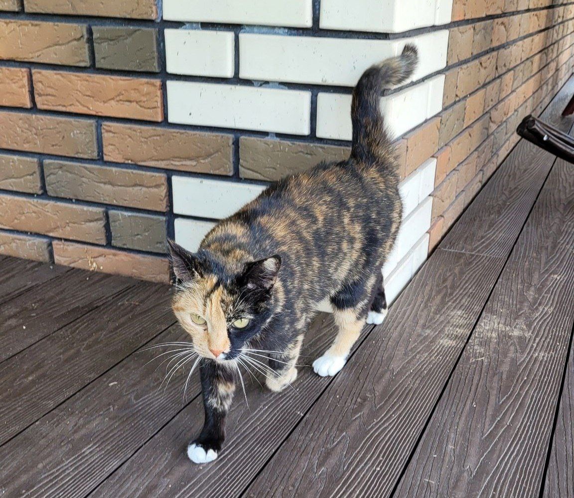Трёхцветная, очень ласковая, ухоженная. На вид домашняя.
