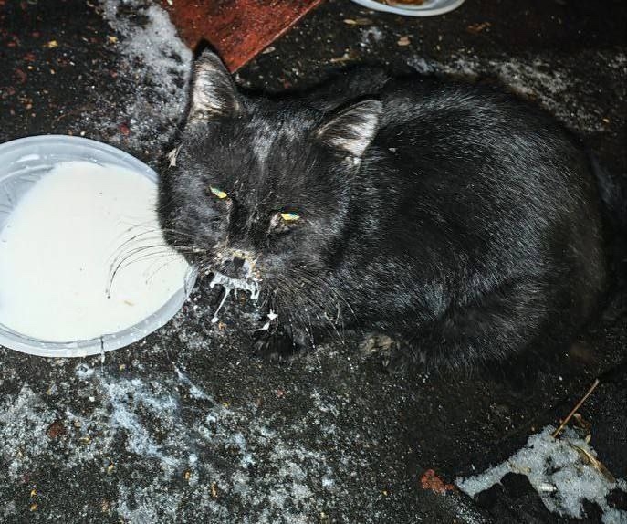 Черный кот/кошка, окрас черный, очень голодный, людей боится несильно. Ранее в районе не появлялся