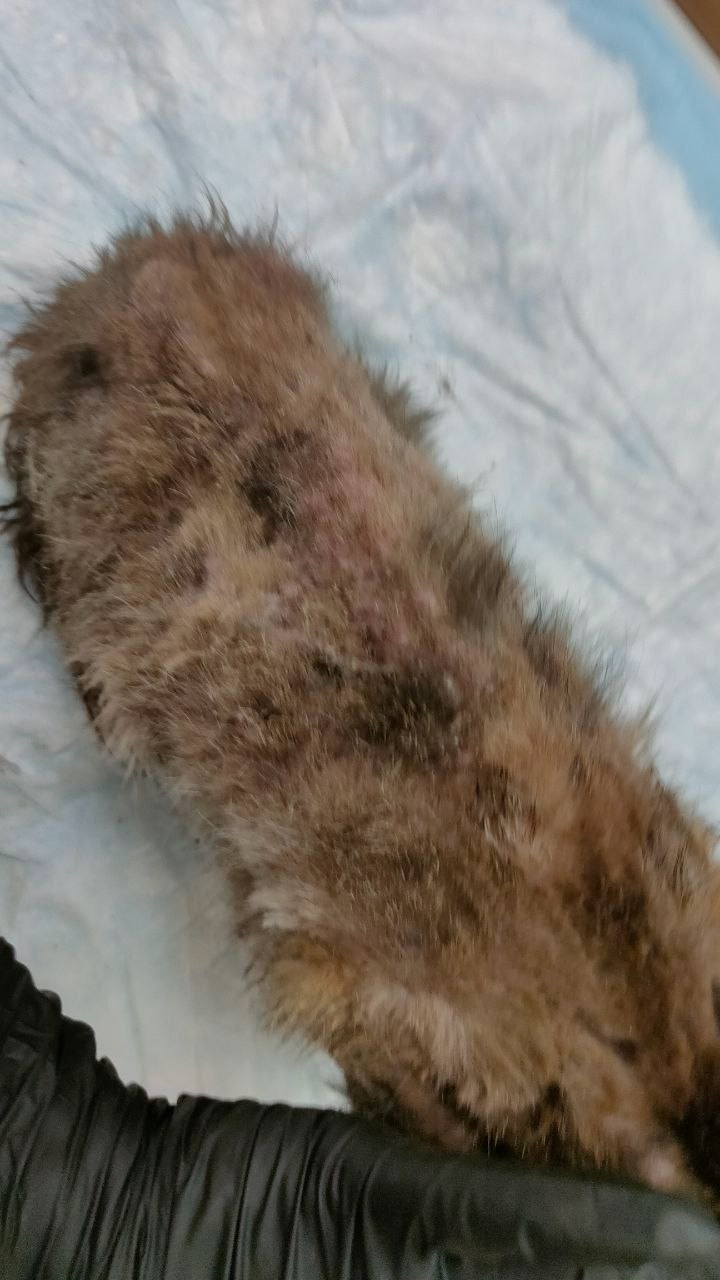 Кот бывшедомашний, кастрированный.  Сильное истощение и обезвоживание. Вес 2.2 кг. Уши чистые. Шерсть выстриженная (с множественными повреждениями кожи), во рту повреждения дёсен, увеличены подчелюстные лимфатические узлы. Стул жидкий. Глюкоза 1.9.