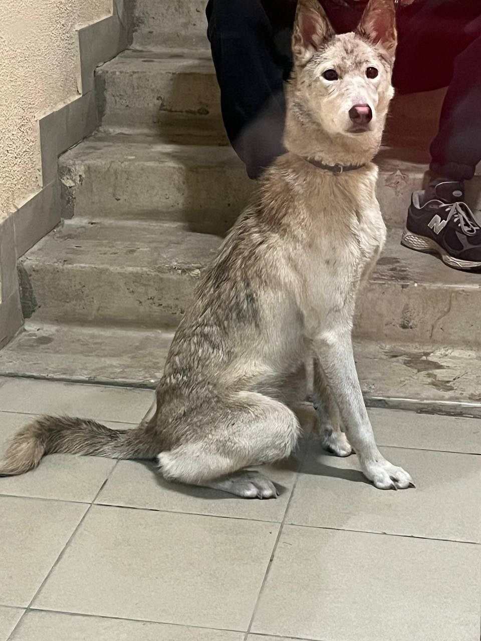 Похожа на смесь хаски, бежевого окраса, девочка. На ней есть ошейник. Носик темненький с розовым пятнышком.